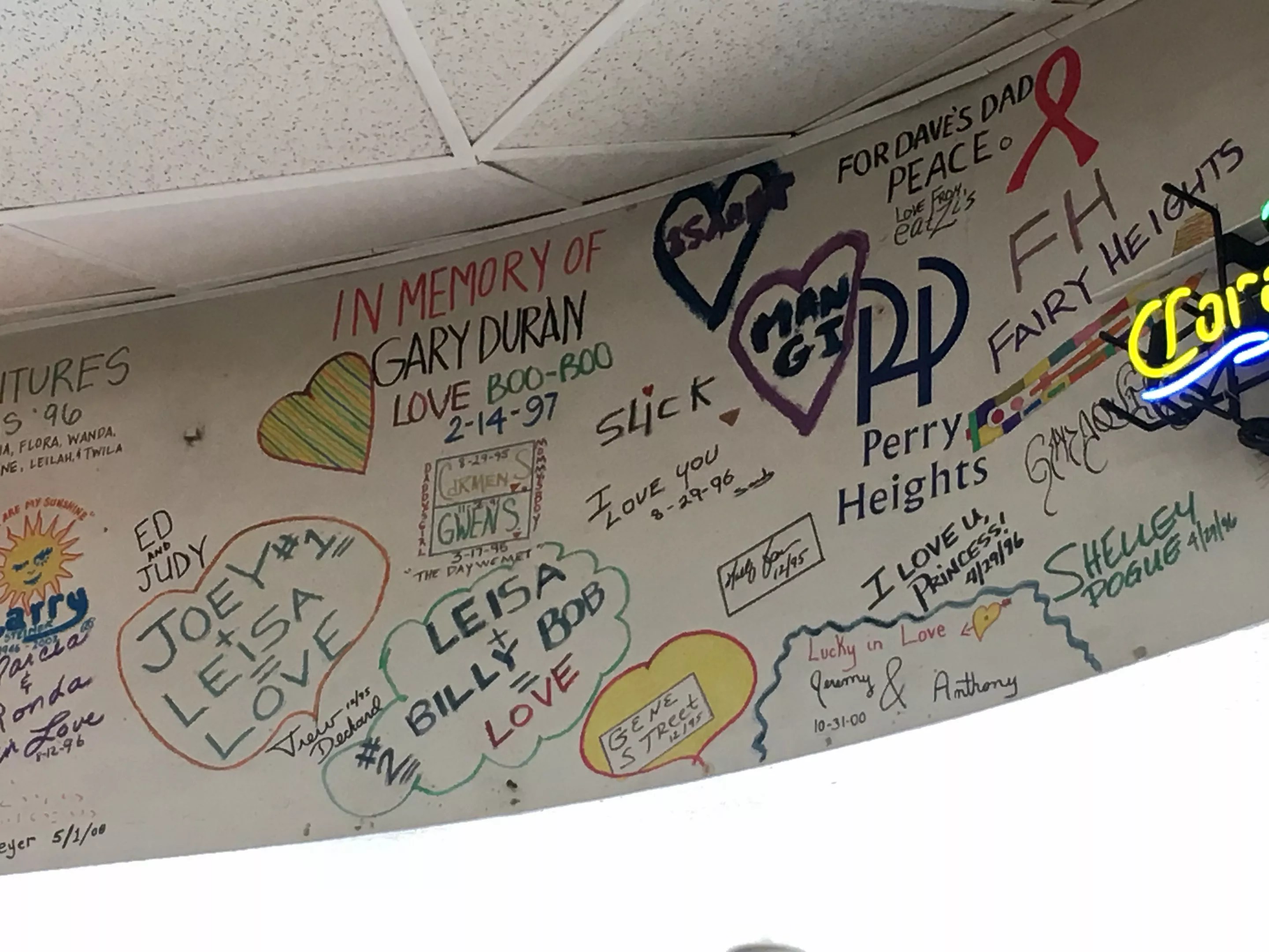 Heartfelt sign-offs line the ceiling at Lucky’s