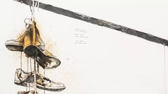 In cities around the world, the sight of shoes hanging from powerlines evokes a host of reactions and has become the stuff of urban legends that range from hilarious to scary. Atlanta-based artist Fahamu Pecou uses the art of “shoefiti” (the act of throwing a pair of shoes onto telephone wires or powerlines) as a metaphor for overcoming and escaping one’s limitations – those real and those imagined.