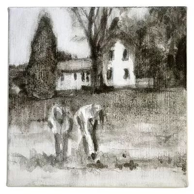 Every piece of art has a backstory, but the one for Lucy Kirkman Allen’s exhibit at Galleri Urbane is especially intriguing. She and her husband bought an 1800s farmhouse in rural Virginia from a man named James. Soon after they moved in, James showed the couple his most prized photograph. In it, three women stand in front of the farmhouse. Two are holding cats and the third is holding a handwritten placard, reading: “We are here in the past, come visit in your time machine.” James had an entire album of black-and-white photographs, mostly of women and young children, and agreed to loan it to Allen. When a Man’s House Is Finished is a collection of acrylic and oil painted replicas of photos from the album.