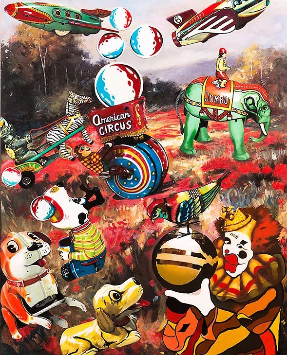 The works in Bizarro refer directly to specific historic events and their contemporary relevance. In “Jackson’s Removal Act,” for example, Barsamian paints Native Americans on the Trail of Tears alongside a yo-yo. The intention is to highlight the contemporary government’s efforts to relocate members of Native American nations, whose lands now contain sought-after mineral properties.