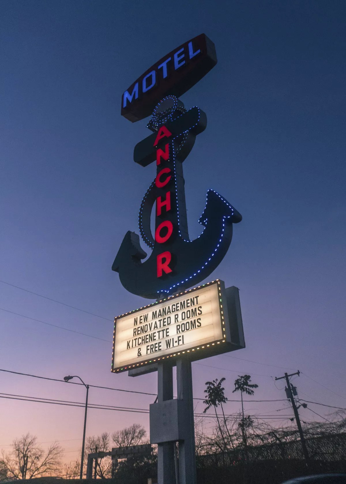 It was during an uneventful drive, a few months back, when my boyfriend and I first fixated on the obscenely tacky sign belonging to the Anchor Motel. Its neon lights flash from blue to green to red, the innocent maritime image etching into our eyes.