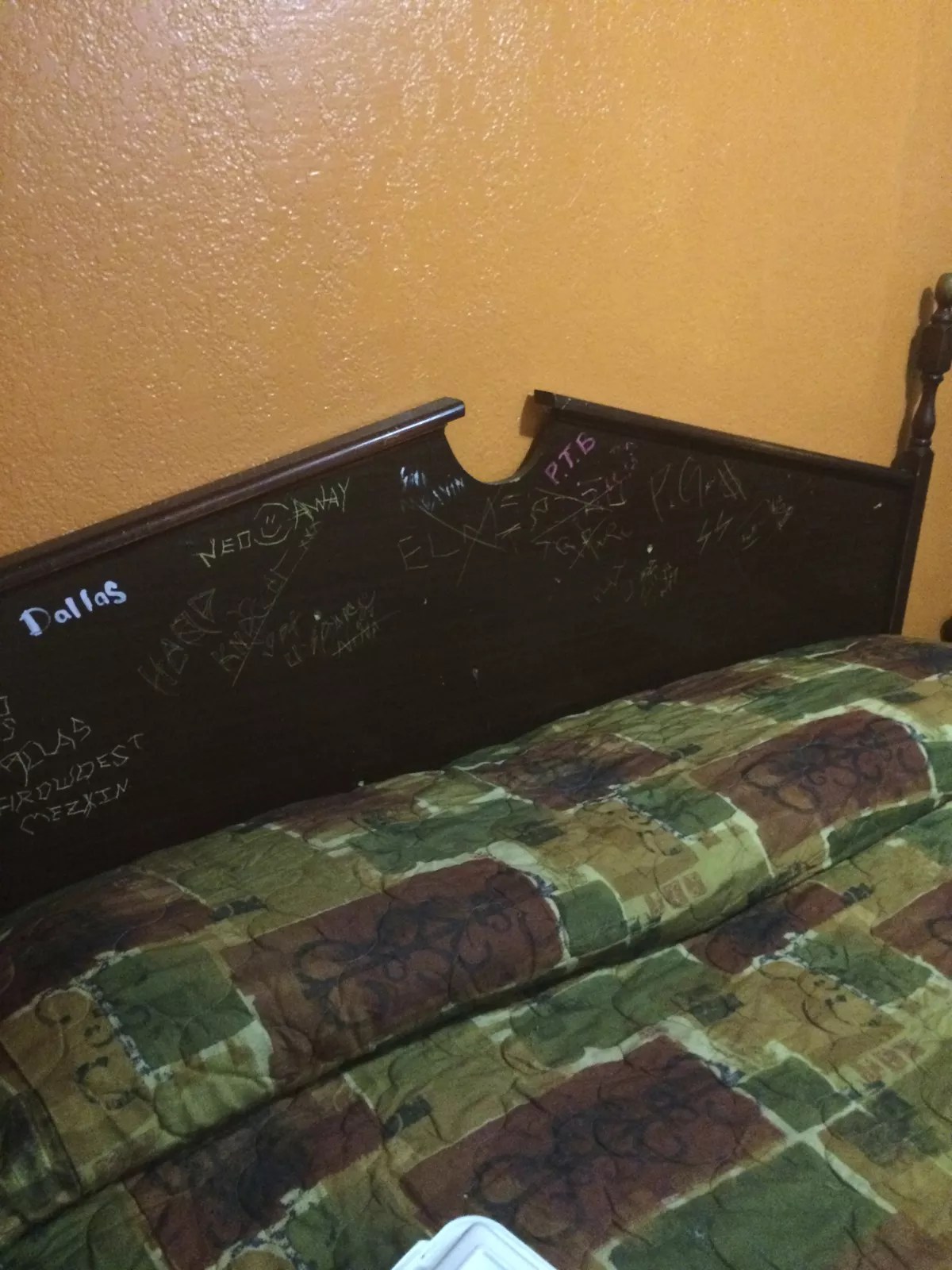 We settle on the Luxury Inn, a name which can only be sarcastic. This place is an actual murder scene, as a woman was found dead on one of the unit’s floors back in ’09. There’s not even an office to walk into, and our dealings are done through a mere window, which offers a glimpse of the owners’ kitchen and living room.