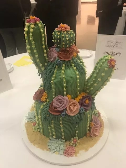 A flowering green cactus cake sat atop a white linen tablecloth near the Eat Your Art Out exhibit entrance. The confection, which had prickly arms that seemed to wave “howdy,” was covered in ribbed, star-studded icing and bedecked with colorful roses and tiny rosebuds.
