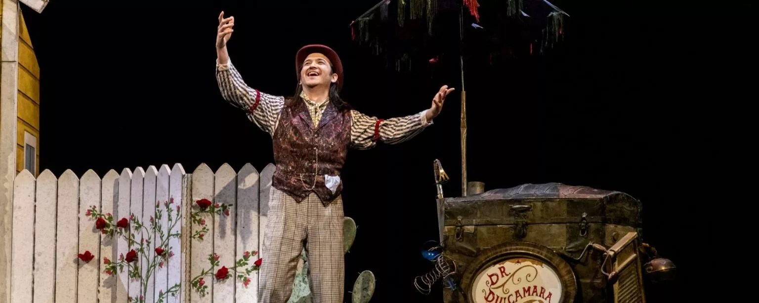 Dr. Dulcamara touts his love potion in The Dallas Opera’s live performance of Gaetano Donizetti’s The Elixir of Love at the Winspear Opera House.