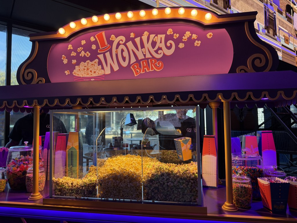 And speaking of appetizers, the concessions are as Wonka-fied as you’d hope. Popcorn gets a colorful twist with green and purple kettle corn, and you can top it with candy like Nerds, M&Ms or gummy bears. (Pro tip: Gummy bears are the safest bet if you don’t want your popcorn to feel like a dental booby trap or widow-maker.) The menu also features themed delights, such as the “Wonka Burger” with blueberry bacon jam, and the “Gloop Brat,” a German sausage that Augustus himself would approve of. For dessert, there are peanut butter bonbons and mocktails like “Veruca’s Very Berry Tantrum.” It’s a feast as imaginative as the factory itself.