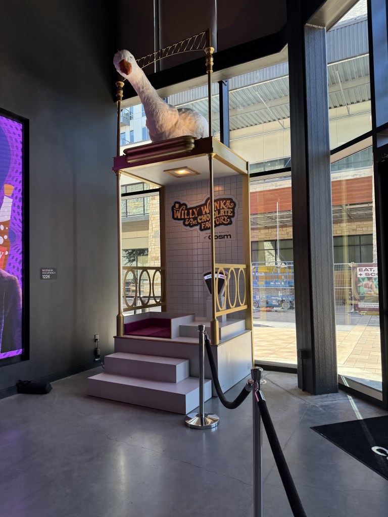 From the moment you step into Cosm Dallas, you’re greeted with a whimsical prelude to the main event. On one side, a platform with a giant goose invites you to test your moral fiber: Are you a good egg or a bad egg? (Spoiler alert: everyone we saw was a good egg, but we didn’t stick around to see if bad eggs actually get the Veruca Salt treatment.) On the same side, a playful bubble-themed photo op sets the tone for the magic ahead — it’s all part of the charm, a pre-show that feels like a Wonka-approved appetizer before the main course.