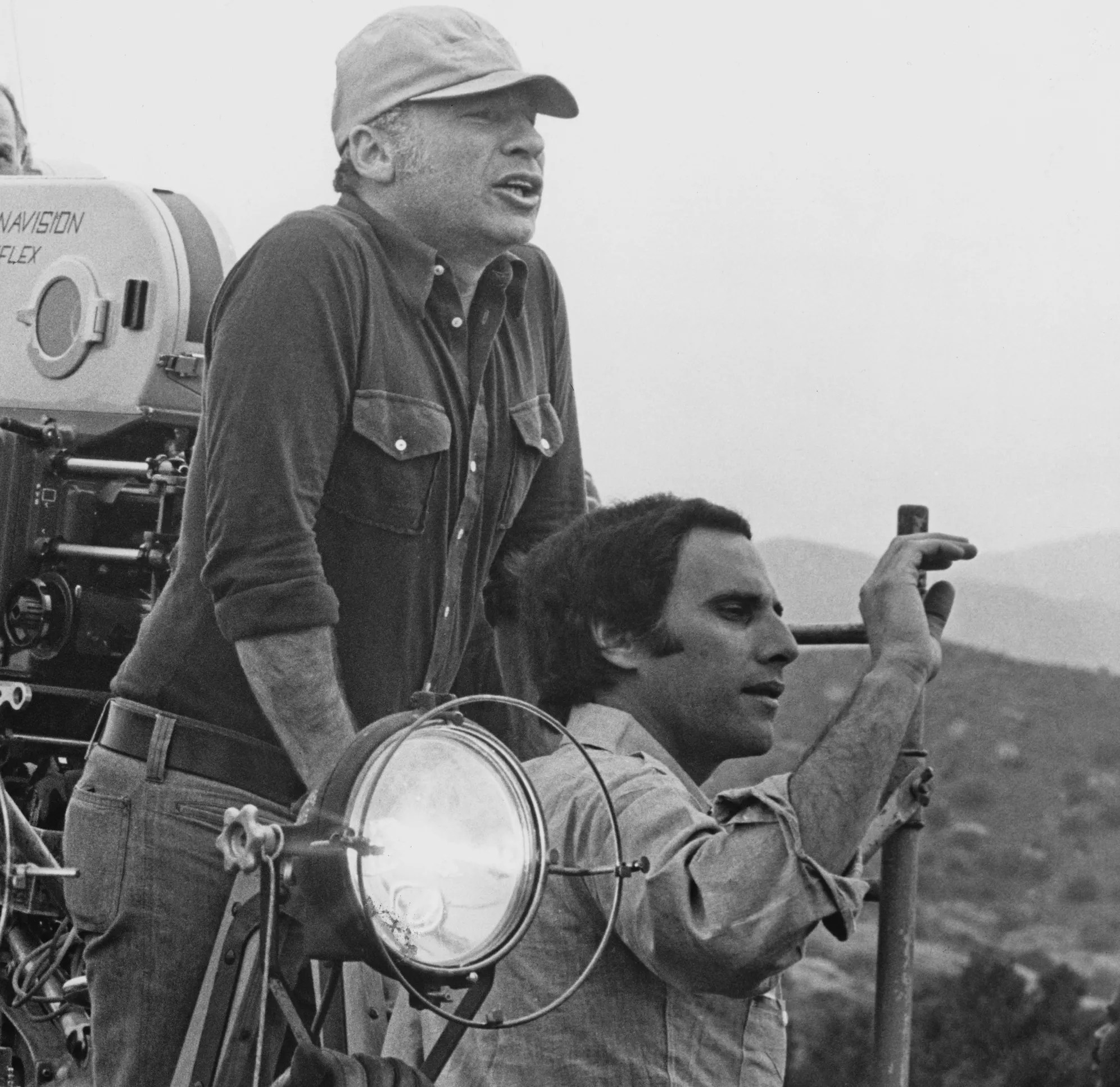 Director Mel Brooks (left) and producer Michael Hertzberg on Blazing Saddles’ set in 1974.