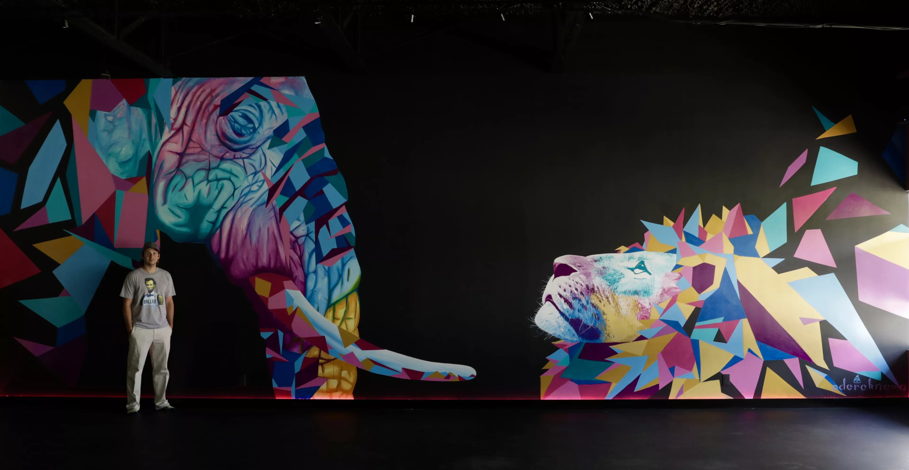 Inside the studio, Nemunaitis completed a 12-by-33-foot piece featuring a close-up of an elephant and lion facing off. Animals are common in his work.