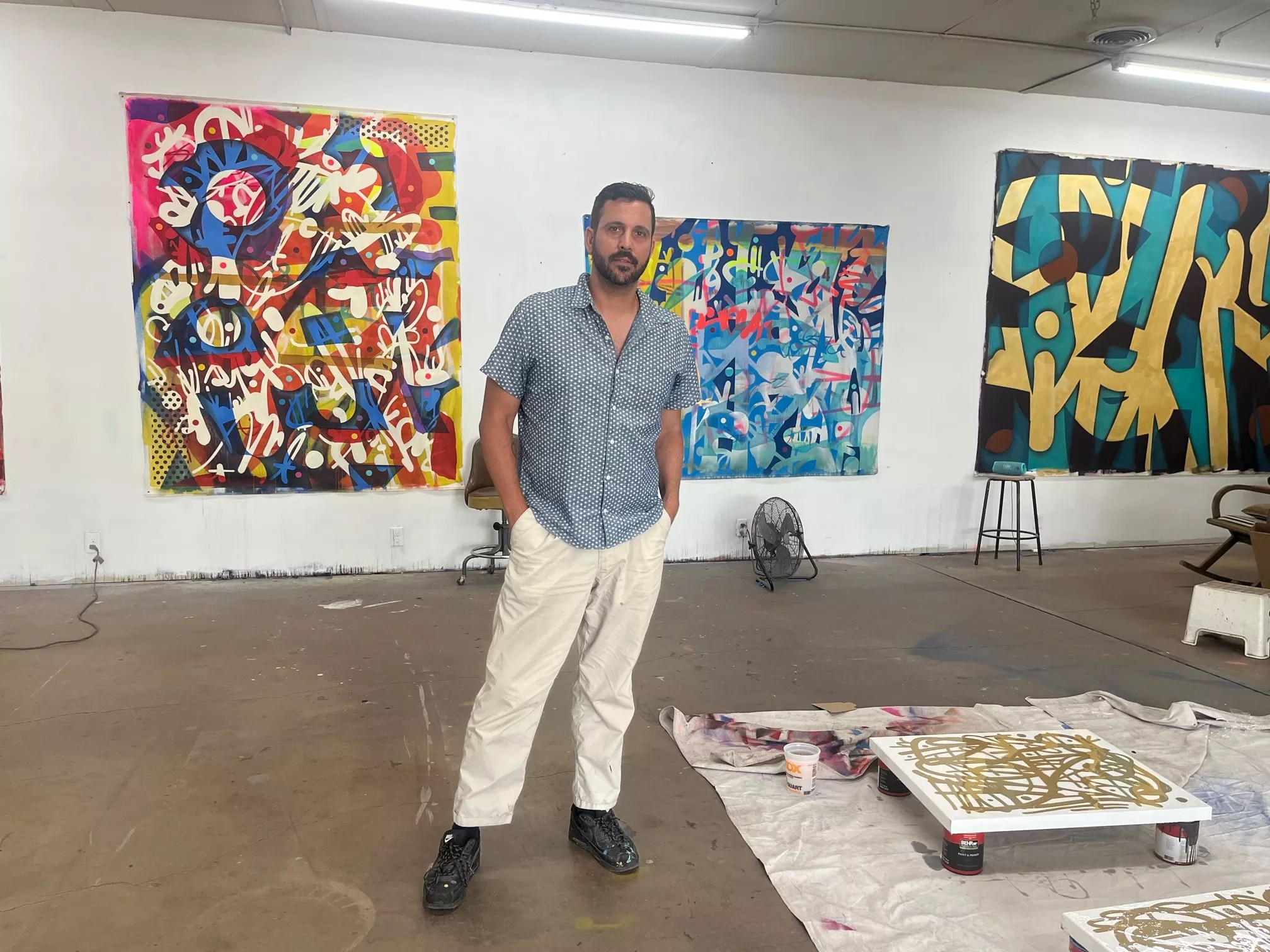 There are elements in his work that trace back to his upbringing in New York, where graffiti and tagging are prominent. Recognizable by sweeping, intersecting lines with defined borders, his style is inspired by what he calls “asemic writing,” a type of writing with no actual meaning.