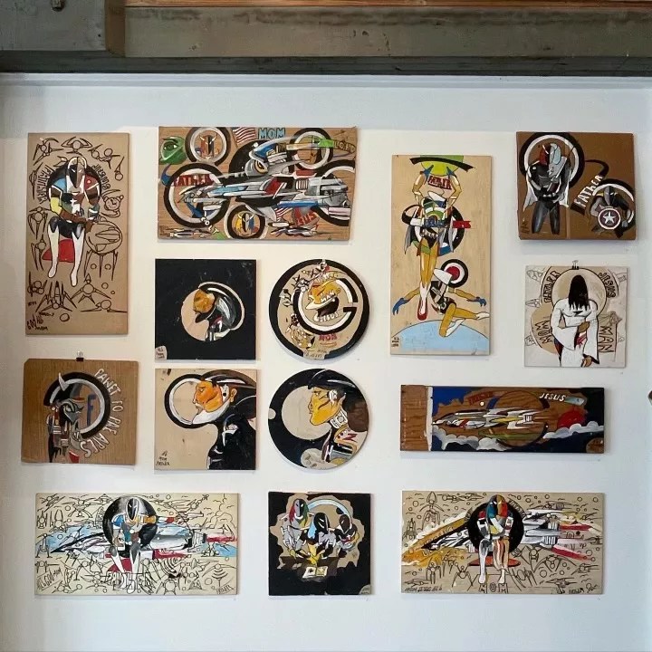 “I met this little old man outside of a thrift store that was basically a self-taught classic folk artist that can’t help but paint,” Baker says. “I tracked him down and brought him a bunch of wood from Home Depot [for him to paint on].”