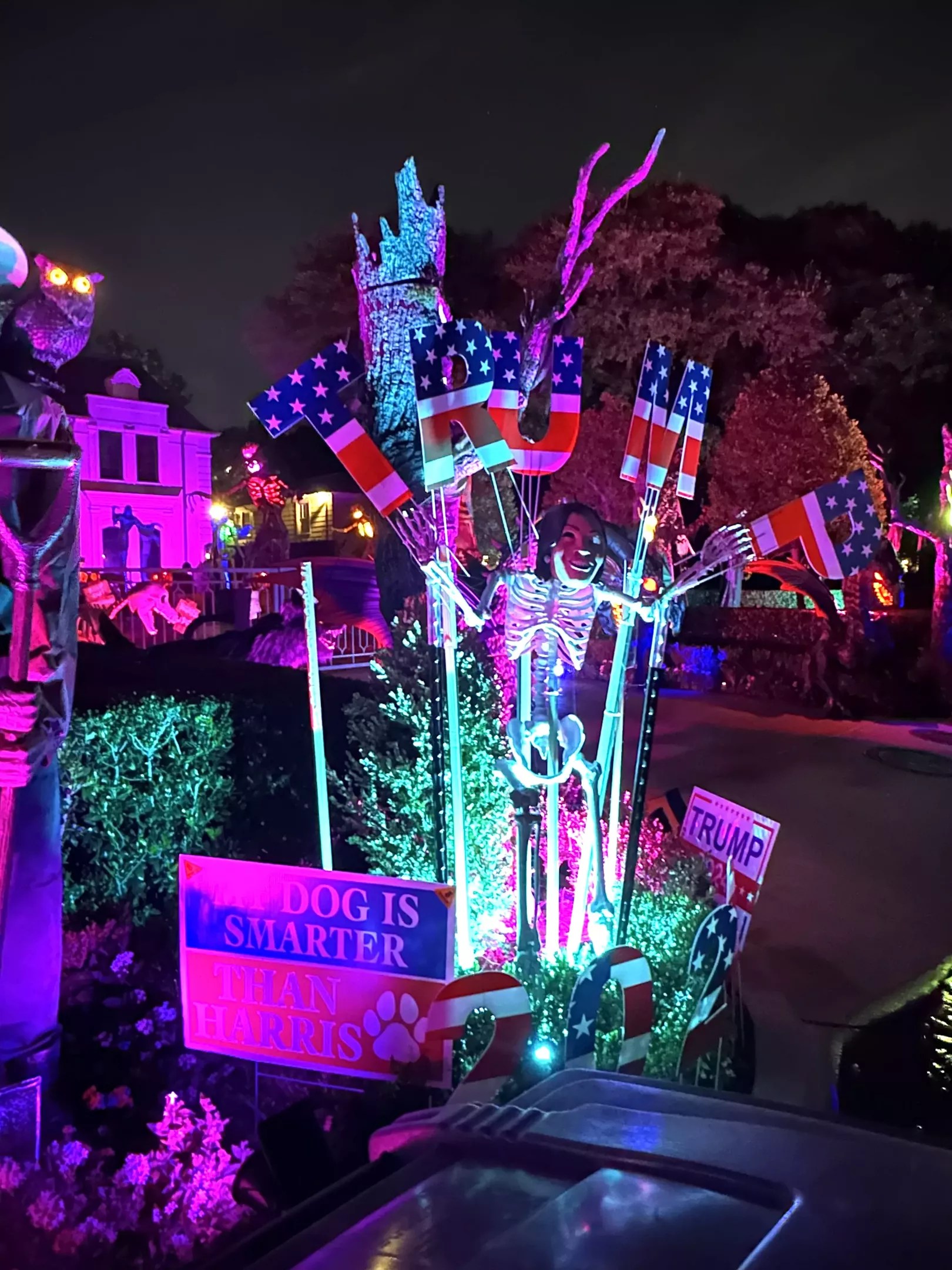 What’s scarier than the potential the U.S. will slide into fascism? We’d say nothing, but tell that to the owners of this giant mansion in Highland Park. Already drawing fans from around the globe, the super-sized display includes 22 (count ’em) giant figures, including pumpkin heads, ghouls, tree men and those ubiquitous giant skeletons. But that’s not what’s REALLY scary. The inflatable Donald Trump and signs saying “My dog is smarter than Harris” are what chills us to the bone. Let’s hope they have the decency to give full-sized candy bars.