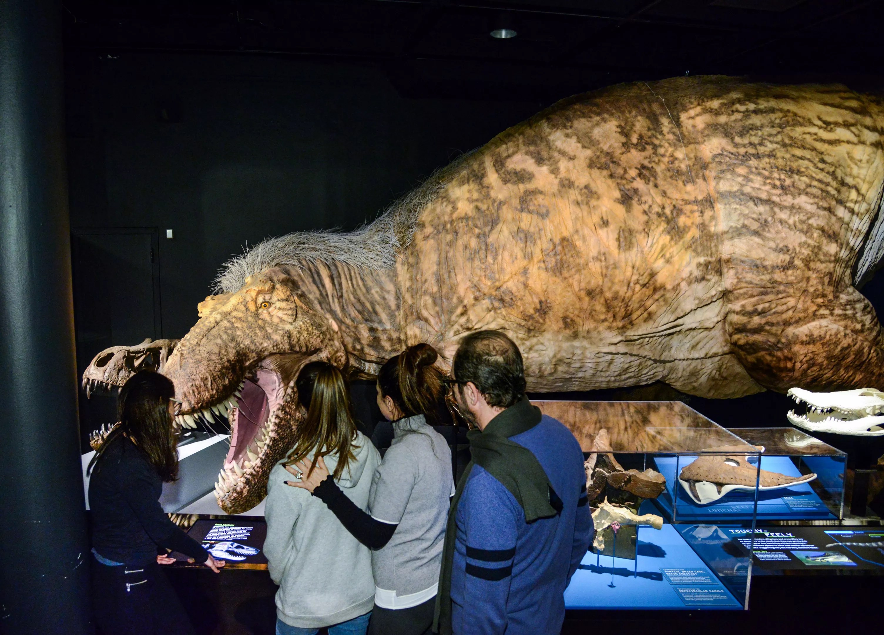 For one, the adult Tyrannosaurus rex boasts unbelievable statistics: 6-9 tons in weight, 40 feet in length, a 5-foot-long skull and teeth the size and shape of bananas. Visitors can see a cast of the skull at the exhibition.
