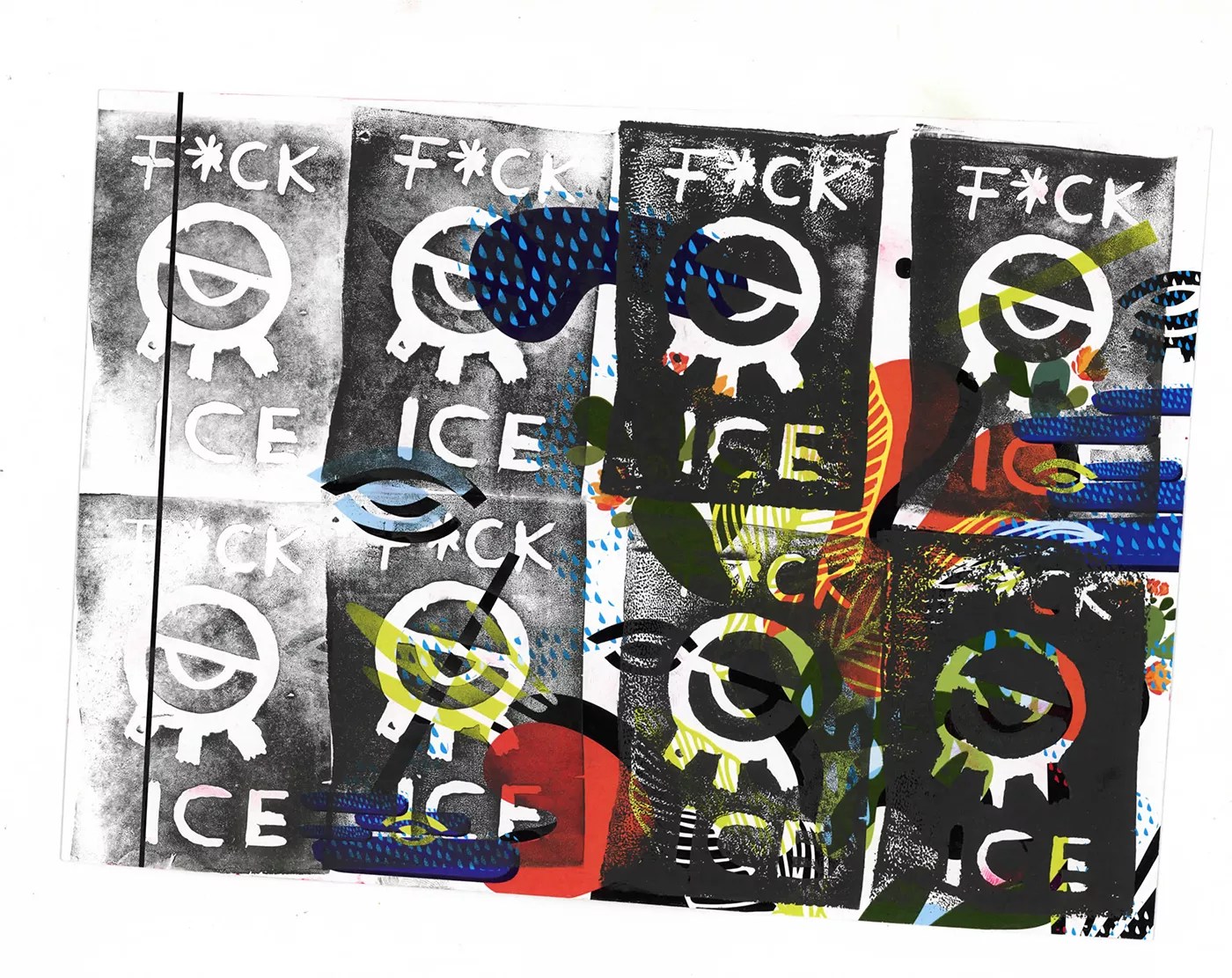 The artist’s latest body of work is a call for humanity. “Resist,” “Solidarity” and “F*ck ICE” are stamped on various scraps of paper along with her iconic eye. The eye is no longer a sign of being seen and valued. It’s a watchdog.
