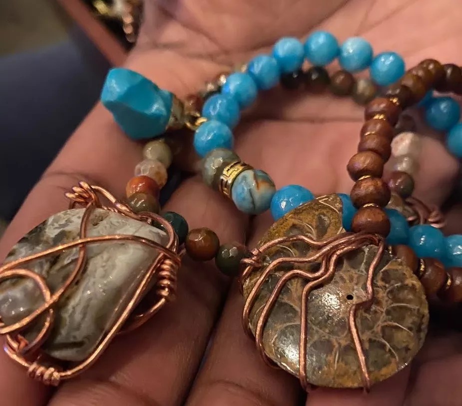 Darian Parks and Terina Smith met in 2017 when they both arrived at the Green Elephant to sell jewelry as vendors for different companies. What began as a friendly business competition would soon become a first meeting straight out of a romantic comedy. When there was only one vendor spot left, the two decided without hesitation to share the last remaining spot, and sparks began to fly. They talked about life and their mutual love of crystals, and openly admired each others’ work.