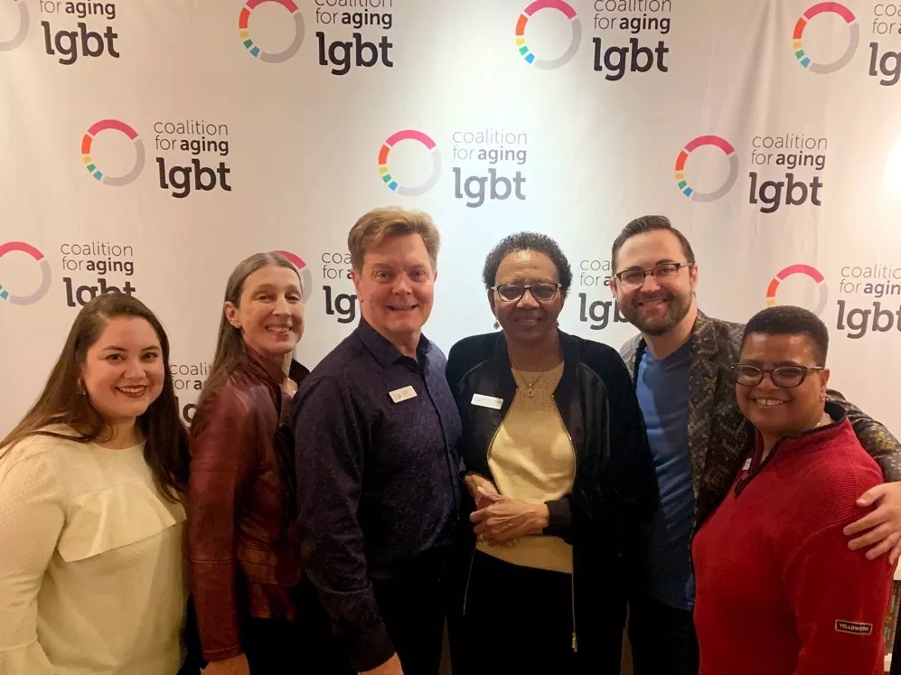 Staff of the Coalition of Aging LGBT, from left to right: Briana Monsalve, Sandy Anderson, Robert Emery, Emma Colquitt, DR Mann Hanson, Kim Macpherson