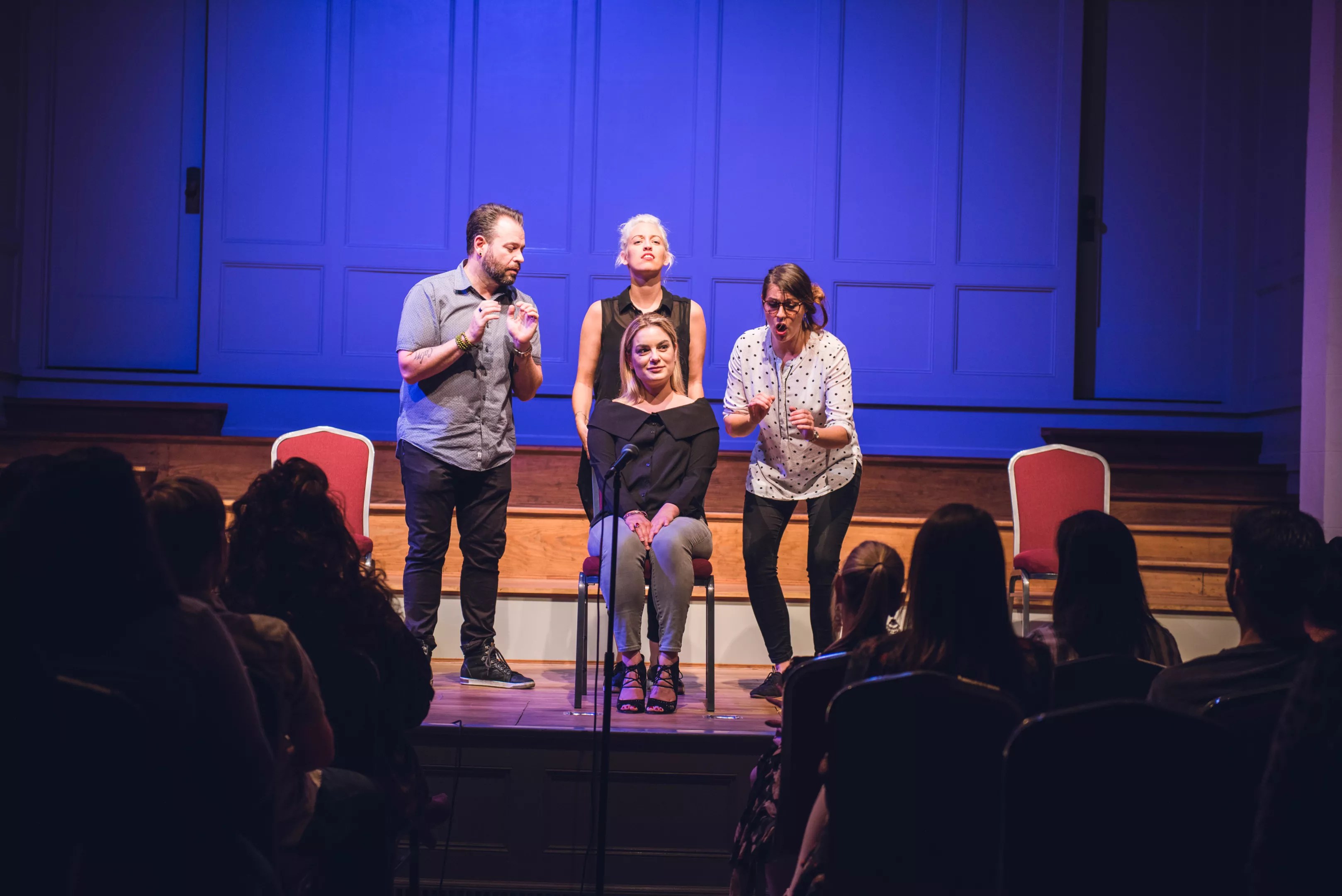 From left: Chad Cline, Lindsay Goldapp and Rachel Farmer perform a scene with an audience volunteer at Stomping Ground Comedy Theater’s fundraiser at Arts Mission Oak Cliff.
