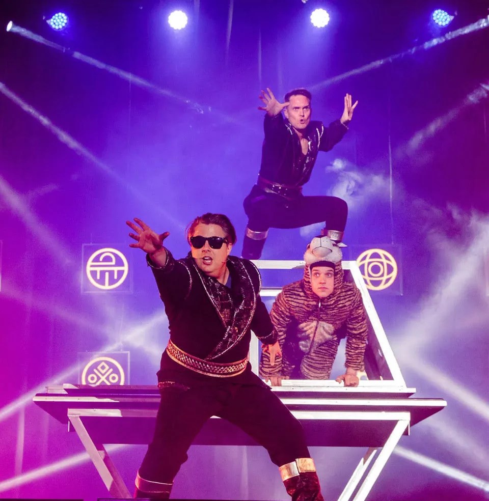 Magicians Richard Young (bottom) and Sam Strange (top) produce a full “tiger” in their comedy magic act coming to the Arlington Music Hall on Sunday.