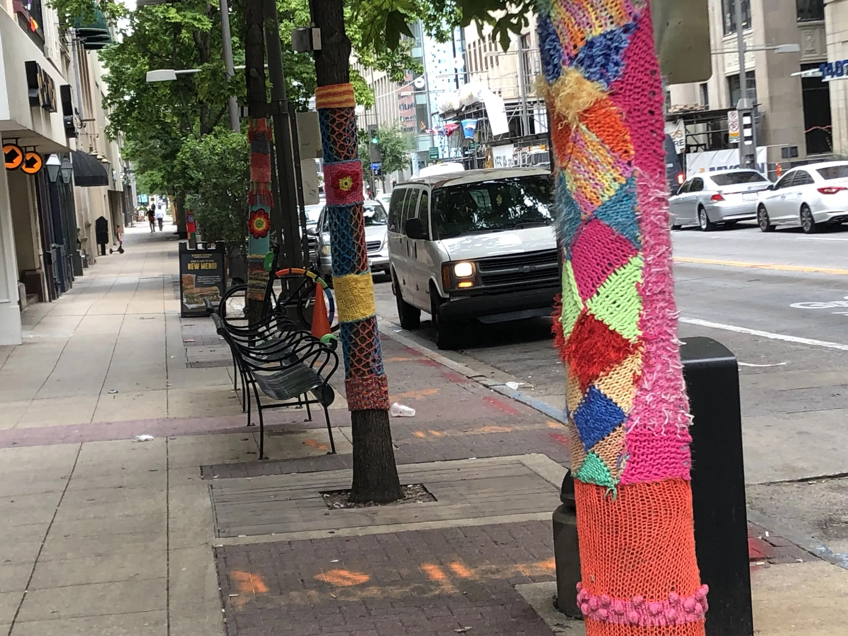 The yarn bombs in downtown Dallas come as part of an initiative to add color and art throughout the city. In recent years, street art has grown seemingly exponentially within downtown Dallas, with the addition of murals and sculptures. According to Ackerman, she was not given any set instructions for her yarn bomb contributions.