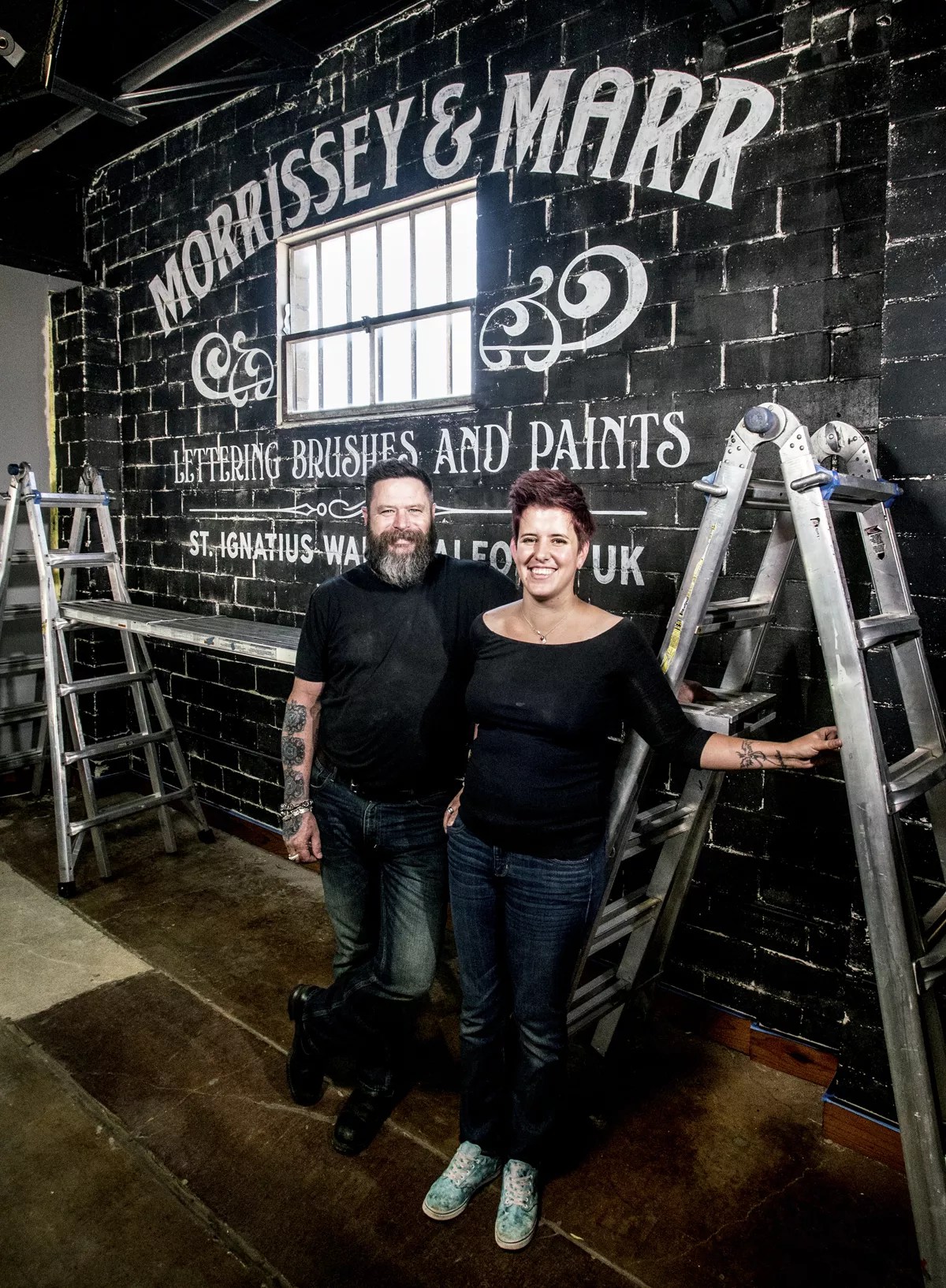 Sean Starr coats his angled Fitch brush in the white, oil-based 1 Shot paint. With a steady hand, he slowly rounds the brush to perfectly line the outside of an uppercase O. The sign reads “MORRISSEY & MARR” in tall, uppercase, pointed-serif letters — a nod to his favorite group, the Smiths. In the short time since he and his wife, Kayleigh, started painting, the fumes have become sharp in the air, but neither is complaining.