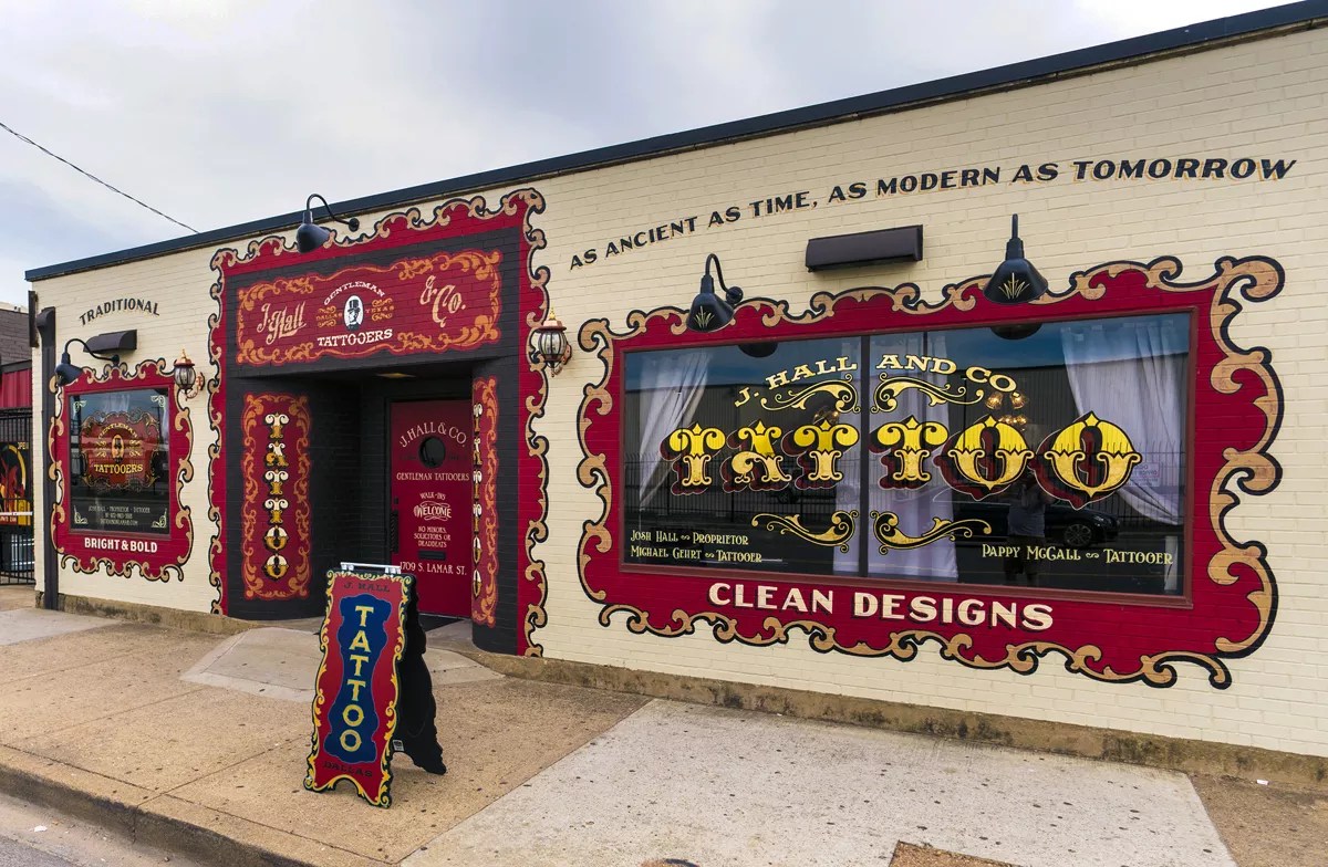 The bright red and gold painted exterior of J. Hall & Co. Gentleman Tattooers is a feast for the eyes on a particularly barren strip of Lamar Street.