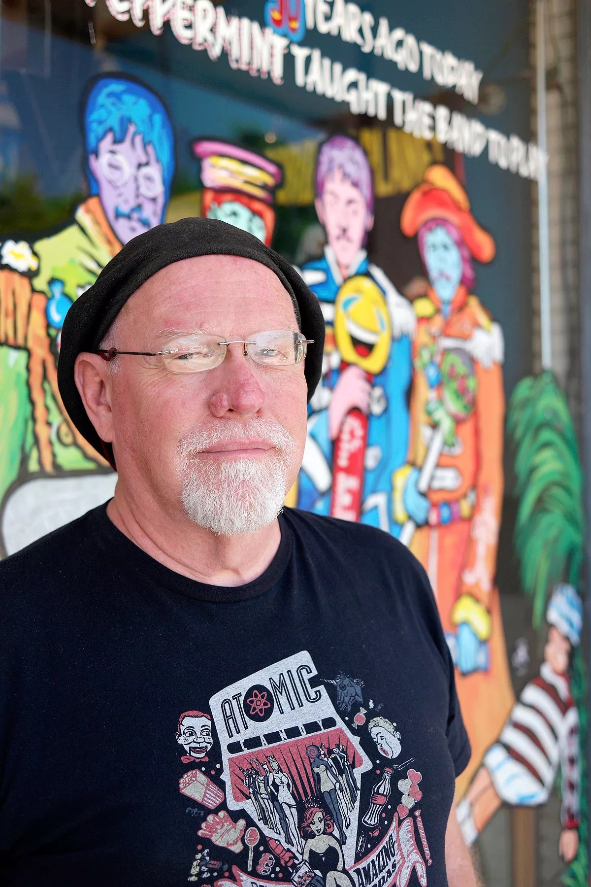 Warren Lunt stands in front of his recently commissioned work – a Beatles window sign for Atomic Candy in Denton.