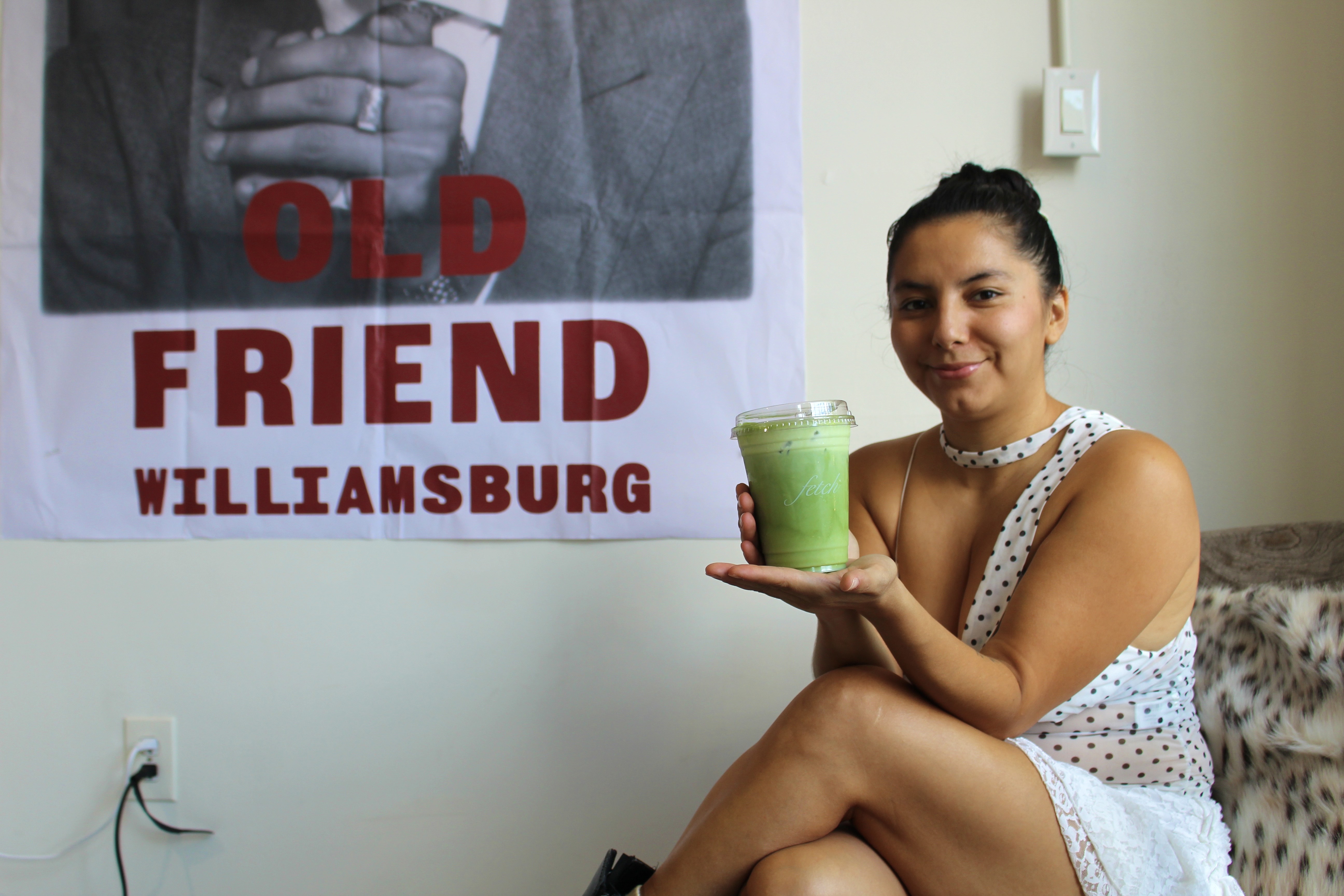 Stepping inside Fetch is like being thrown into a coquette circus, with a red lipsticked couch at the center flanked by two rotating clothing carousels. One in the front, which collects Fetch’s latest curated finds, and one in the back, with a more traditional vintage selection that includes options for men. To the left side of the room, a small DJ booth spins a pink heel on the turntable, playing an eclectic pop playlist that ranged from Depeche Mode to ABBA in the time we spent there. To the right side of the shop sits a sizable matcha and espresso bar, with Hall’s sister, Renee Gonzalez, serving up drinks every day.