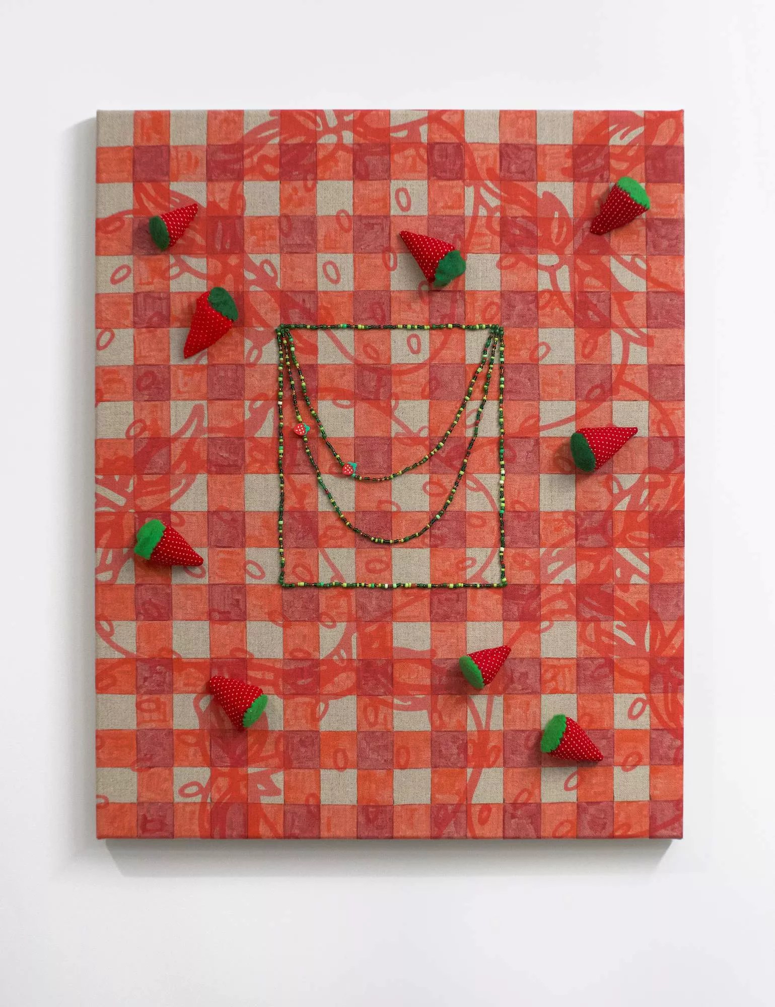 “I’ve been interested in fruit from a kitschy perspective,” she says. “I’ve been collecting fruit beads, stickers, charms. There’s something about the duality of fruit as a culture symbol. It’s this cutesy, girlish item in some presentation, but it’s also a metaphor for female sexuality. In researching differences, ripeness and sexuality are certainly paired. There’s this fine line, a quasi-questionable line, between when fruit moves from tasty to sexy.”