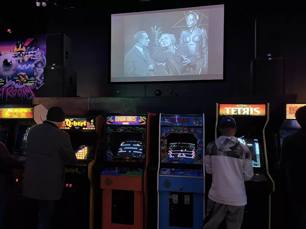 An overhead screen at Free Play Dallas in Trinity Groves plays the classic sci-fi film Metropolis as players try to get the high score on classic arcade machines.