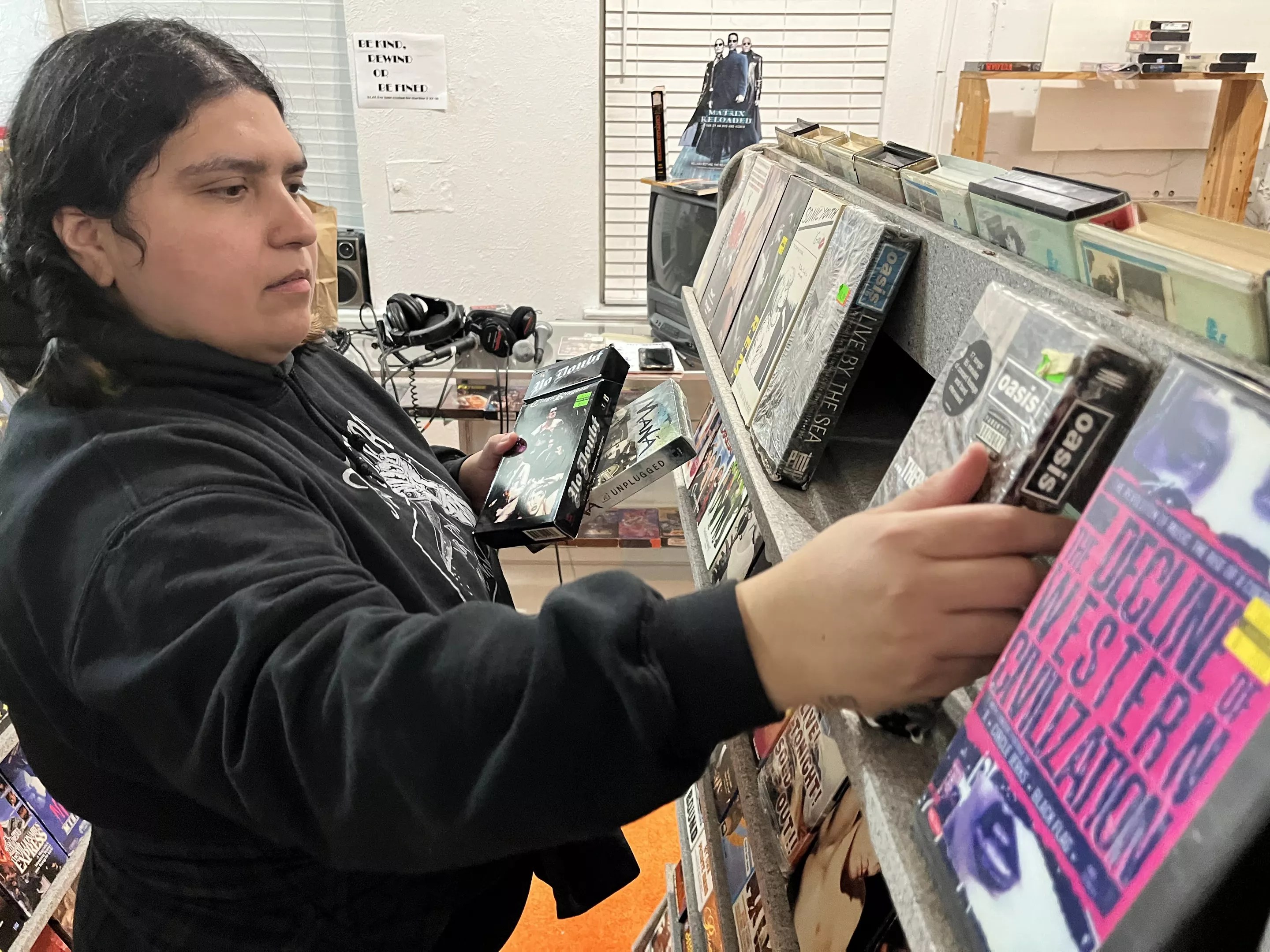 Eli Luna, founder of the Dallas VHS Swap, sets up the classic rewind reminder sign at the front desk of The Video Crypt at the Texas Theatre.