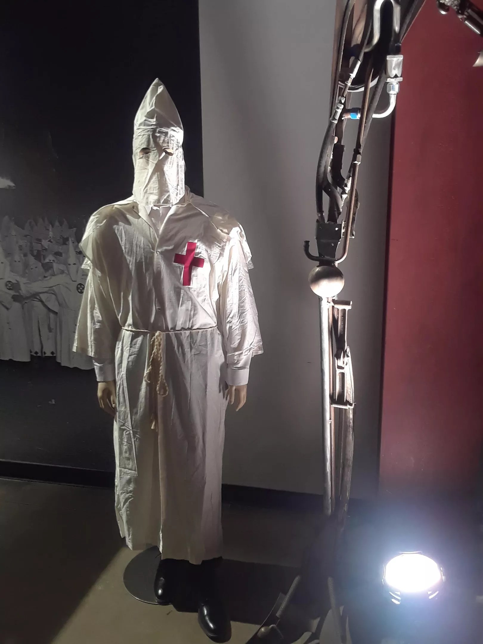 In the exhibit, department store mannequins wear Klu Klux Klan outfits. One was dressed as an ISIL fighter. Armed with an AR-15, he stood next to what I assumed were two journalists he planned to behead after the party. They were wearing orange jail threads and were locked in a cage from Marvel’s Thor Ragnarok movie.