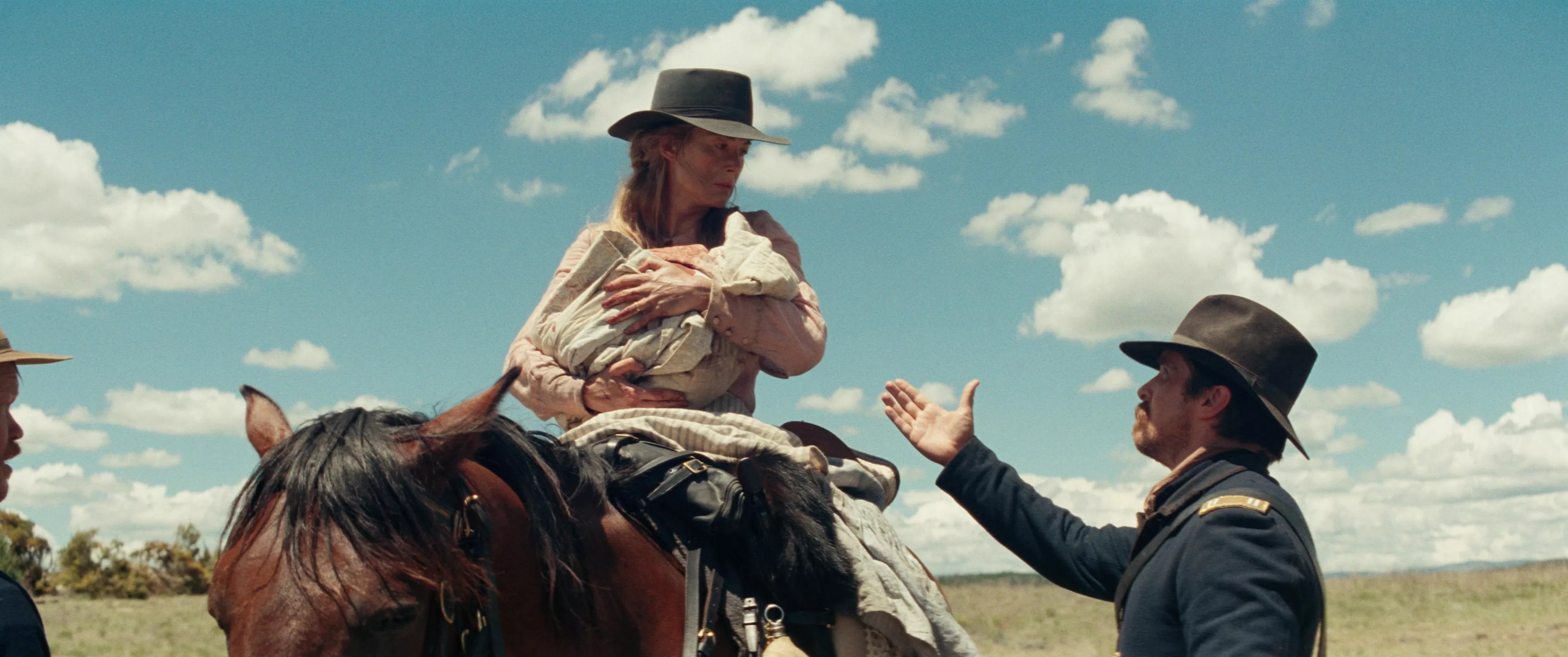 Bale confidently strikes these notes of hard-edged sensitivity, inserting respectfully gruff “ma’am”s between offers of warmth, water, blankets, food. Reconciling this figure of natural empathy and mesmerizing focus with the previous wobbling brute who reflexively emits “bitches” and “bastards” is a bizarre task; the disjunction seems less a sign of a protagonist with complexly contradictory sympathies than a reflection of the psychological fuzziness of Blocker’s sketched-in backstory. When Cooper wants to humanize Blocker, we get nicely unhurried scenes, like the bedside one in which Blocker is brought to clenched tears at the sight of his bandaged, bullet-ridden longtime associate, Cpl. Henry Woodson (Jonathan Majors); when Cooper wants to remind us of the man’s flaws, we get a Max Richter eruption or a dirge of exposition, as with the fractional cameo from Bill Camp, whose journalist character helpfully announces that Blocker has taken “more scalps than Sitting Bull himself.”