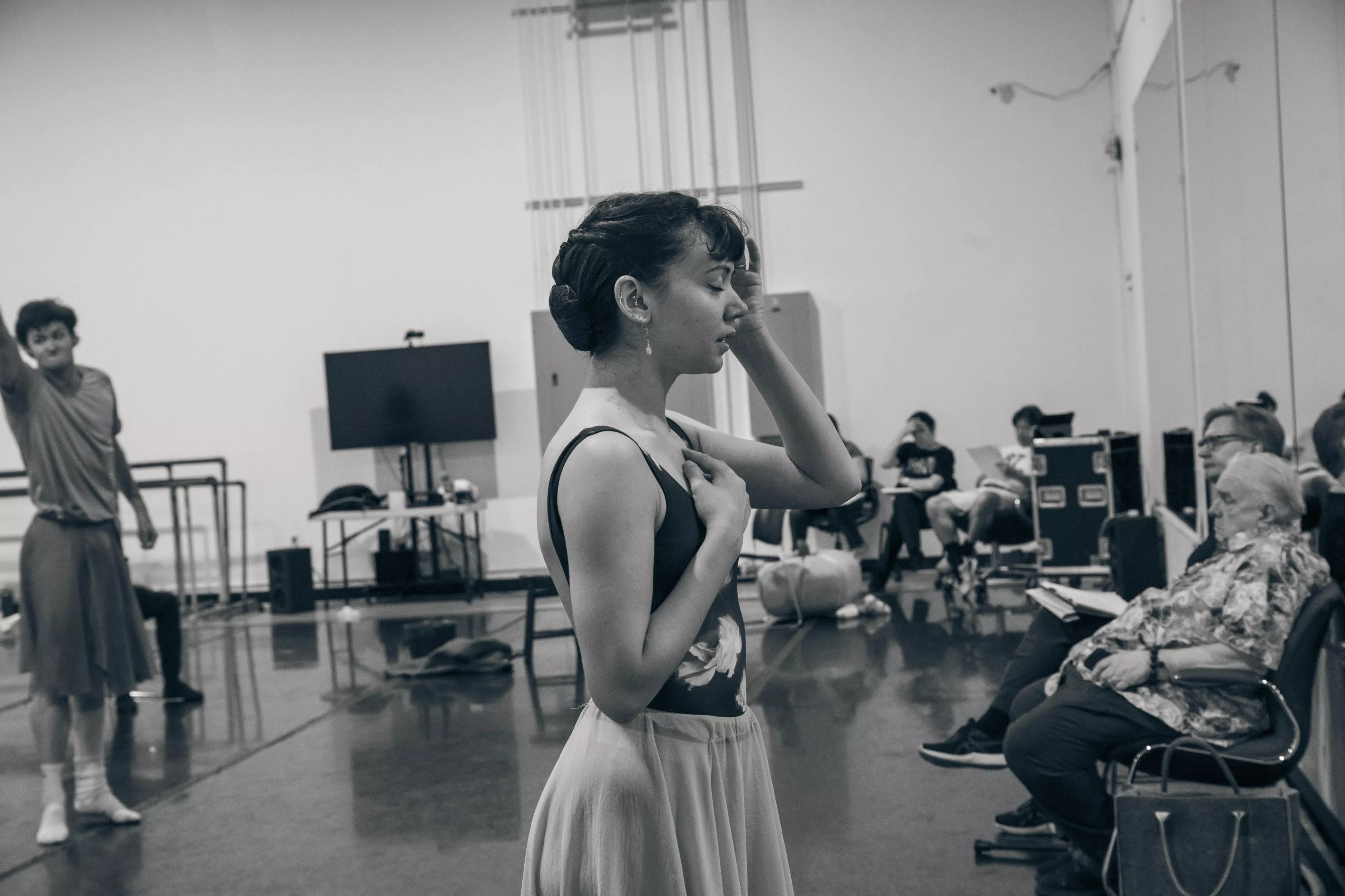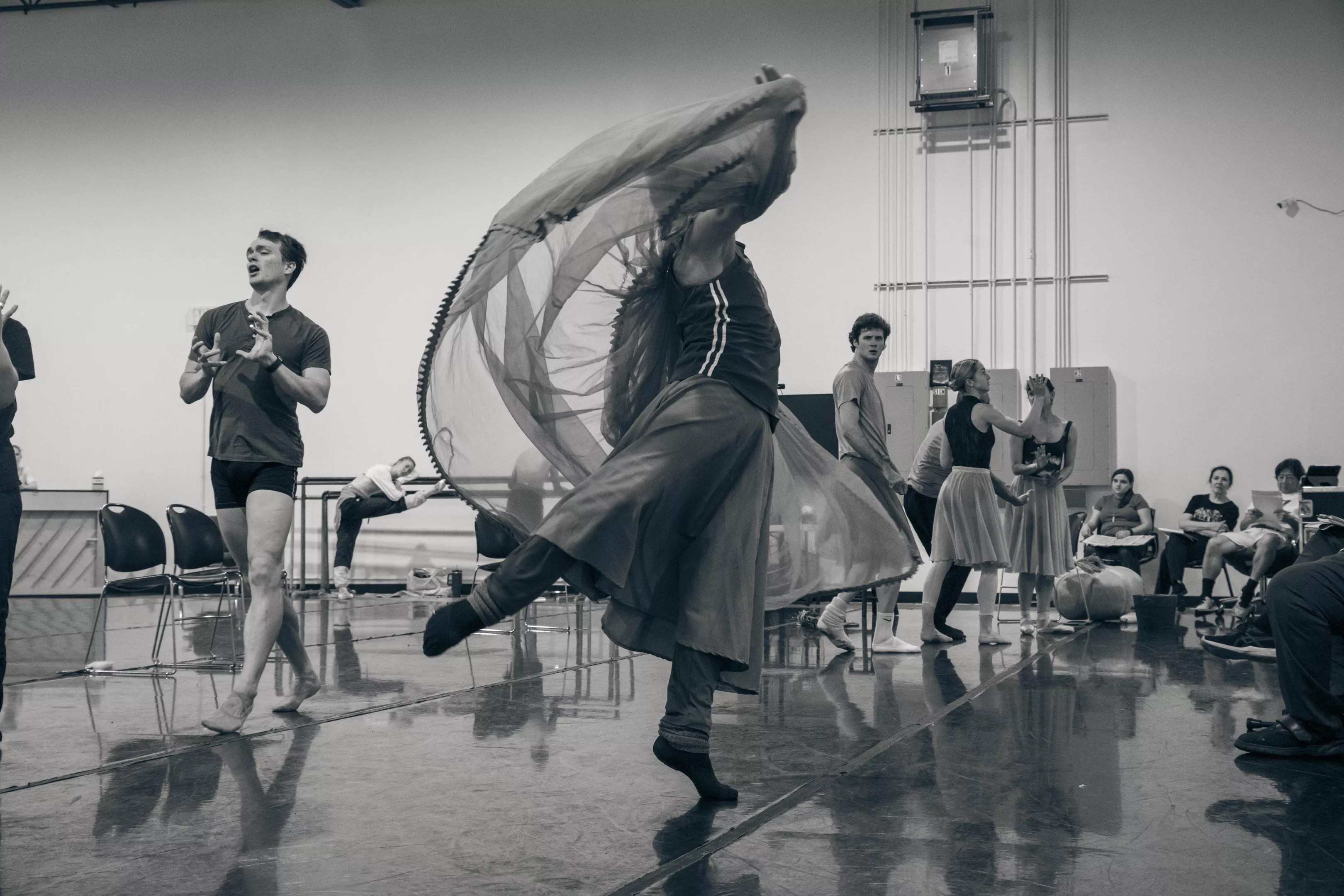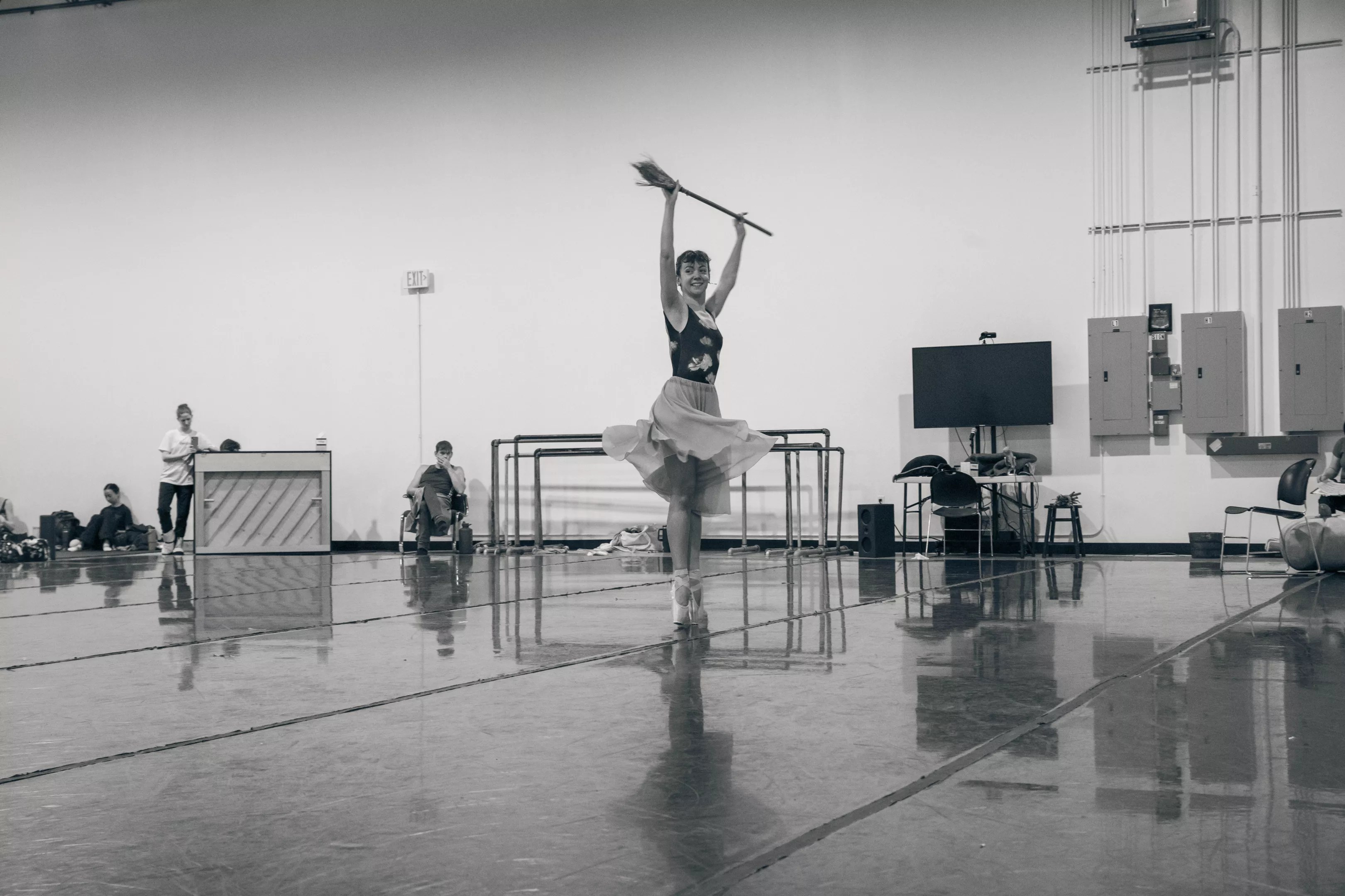There are no set pieces in the rehearsal studio, and the company uses only the bare minimum props and costumes – a broom for Cinderella to dance with during one of her solos, skirts for the ugly stepsisters (played by male dancers in drag) to comically swish around and a feather fan for the wicked stepmother to glare menacingly from behind.