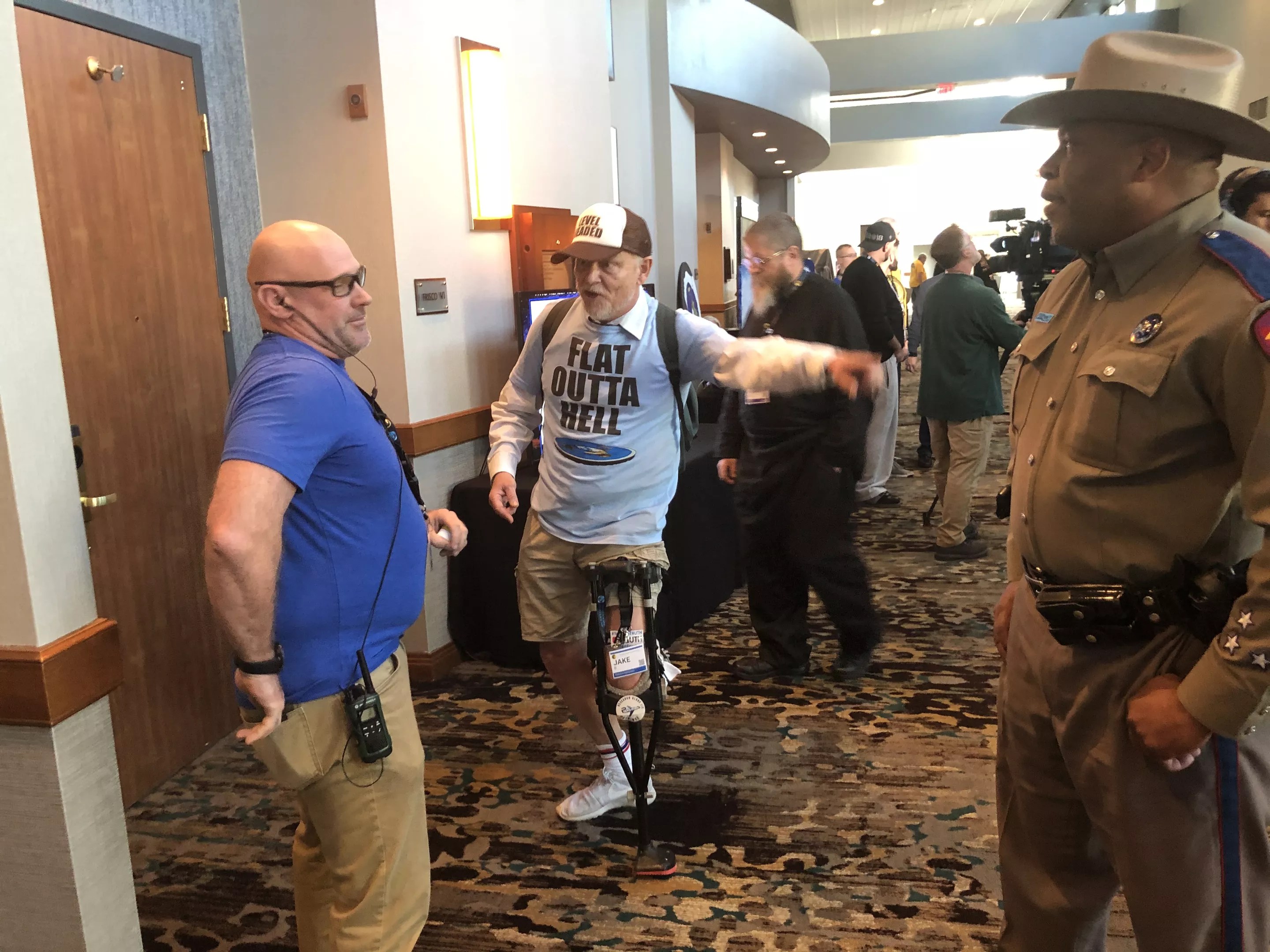 A state trooper steps in to keep an eye on a small conflagration between Flat Earth International Conference director John Gabrielson and Tony Barbieri, aka Jake Byrd.