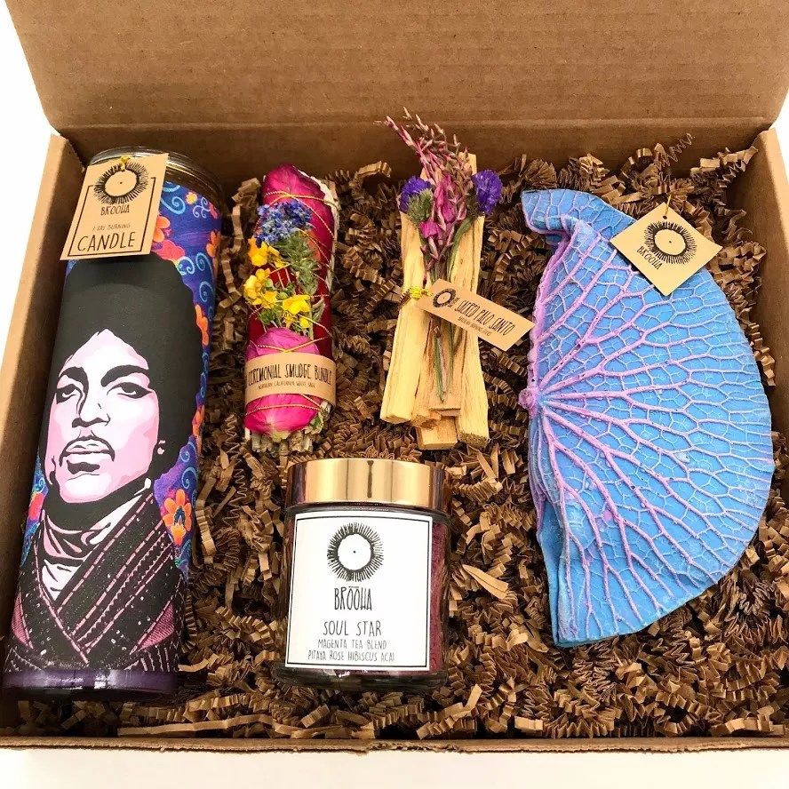 Fort Worth artist Choke has an online market called Brōōha sourced from international artisans. Our favorite pick is the Lotus Collection package, which comes with a Prince candle, a vegan and sustainable Blue Egyptian Lotus bag, Soul Star tea, ceremonial sage bundle and Sacred palo santo.There’s also a similar version with a Frida Kahlo candle.