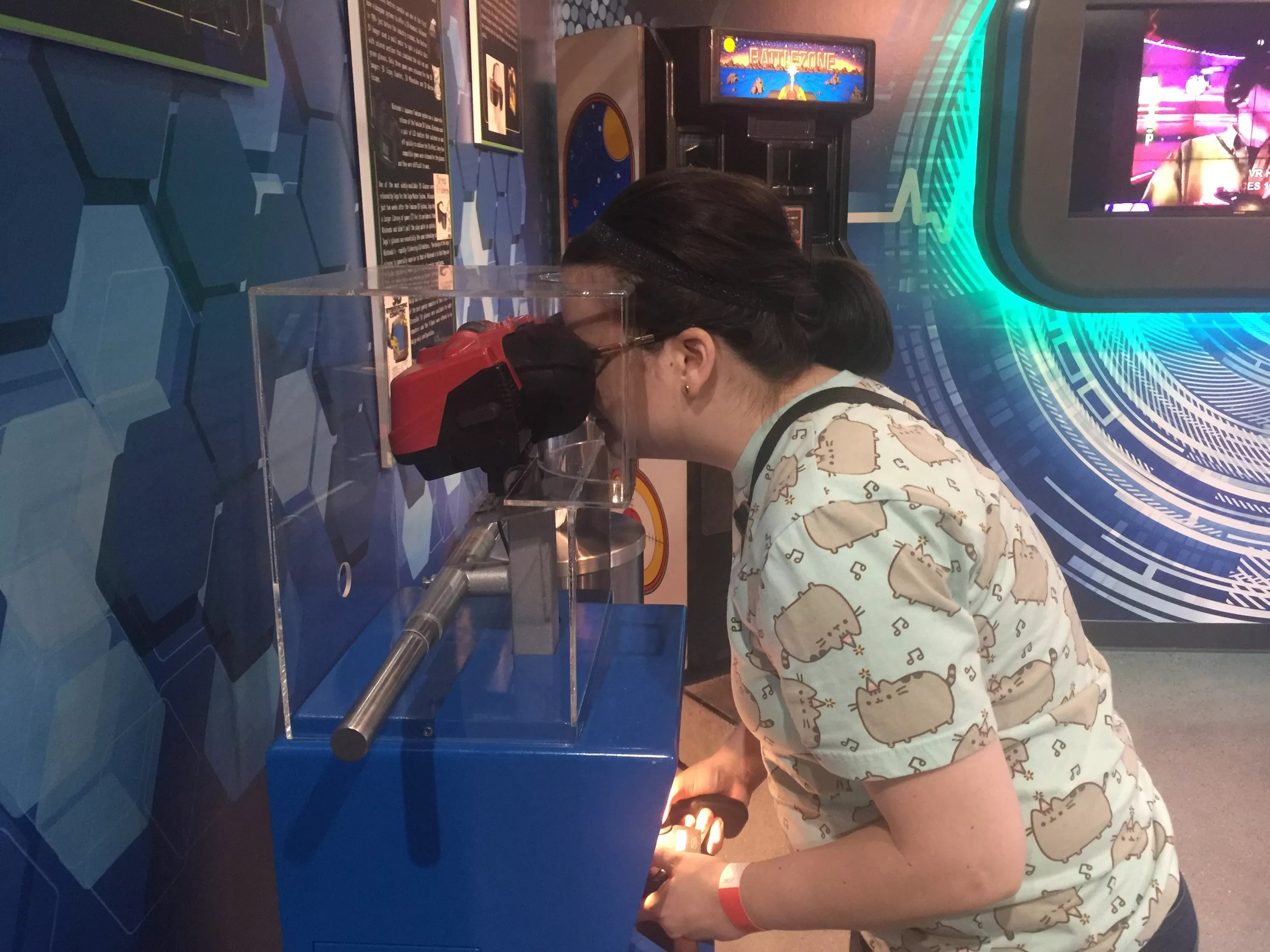 Ashley Wolff of Plano plays Virtual Boy Wario Land on Nintendo’s Virtual Boy console at the National Videogame Museum in Frisco in their new exhibit on virtual reality technology.