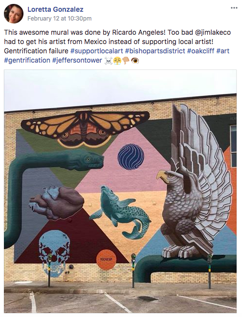 The debate began when Loretta Gonzalez posted a picture of the mural to the Oak Cliff Neighborhood Facebook group. “This awesome mural was done by Ricardo Angeles,” Gonzalez wrote in her post. “Too bad [Jim Lake Companies] had to get his artist from Mexico instead of supporting local artist! Gentrification failure.”