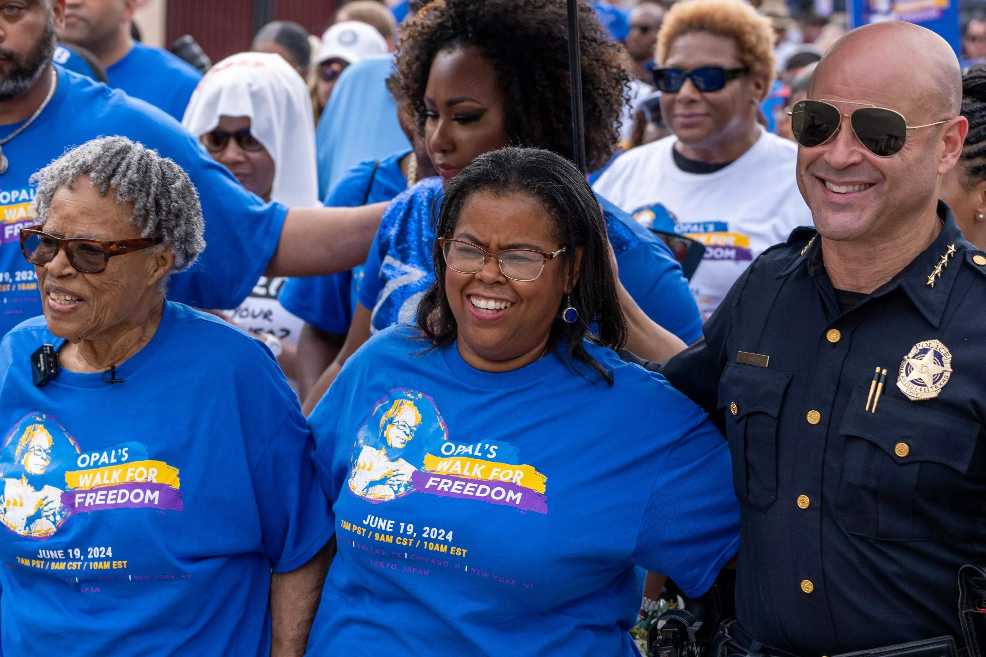 Opal Lee walks with Dione Sims and Dallas Police Chief Eddie Garcia.
