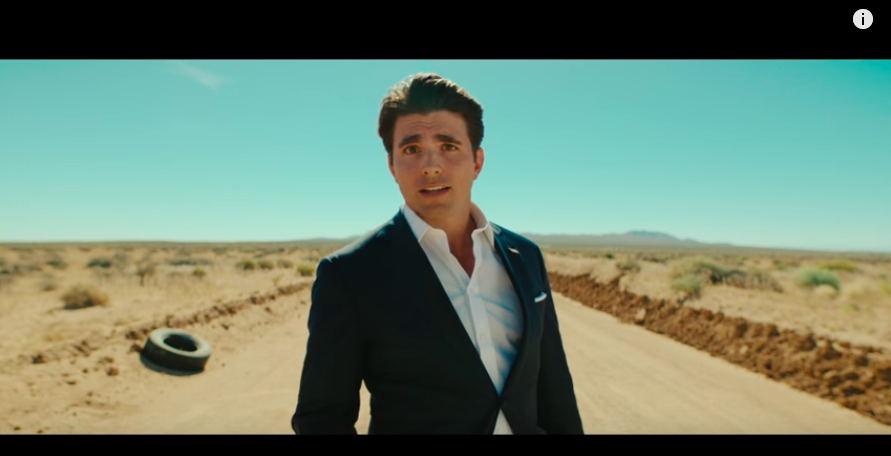 “I’m not just your every man,” Fisher says as Cruise, while sprinting through the desert. “I’ve literally been every man. I’ve been a Navy pilot, a lawyer and a Navy lawyer. My opponents will say I was a pimp in high school; it’s true. But I grew up fast in NASCAR country and started a small business as a sports agent to set a better example.” Titles of his movies appear on the screen after every reference. The video has more than 3 million views.