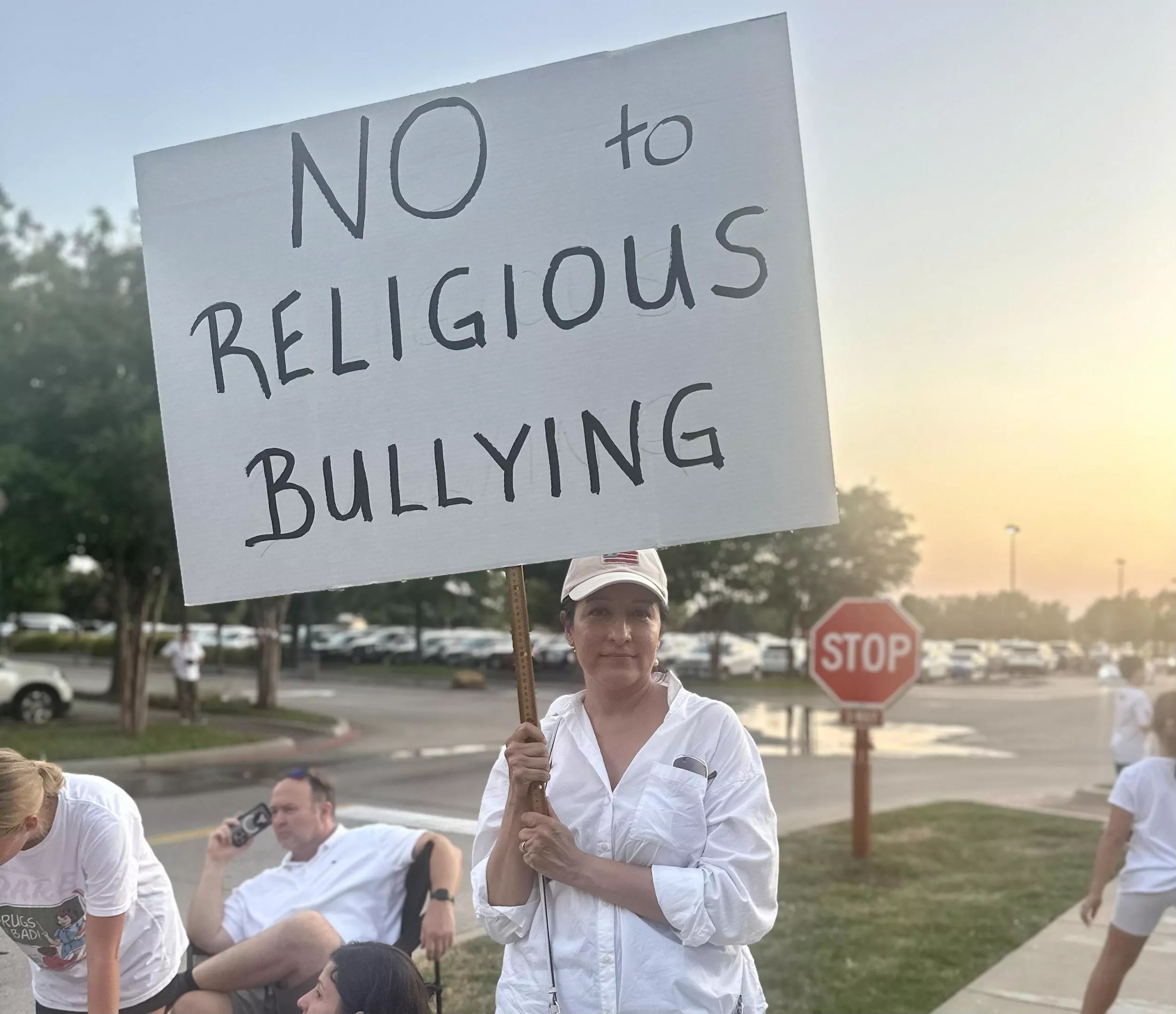 Among the opposition was Fairview resident Maria Nevils, who brought a poster board sign with the words “NO to Religious Bullying” written with a Sharpie.