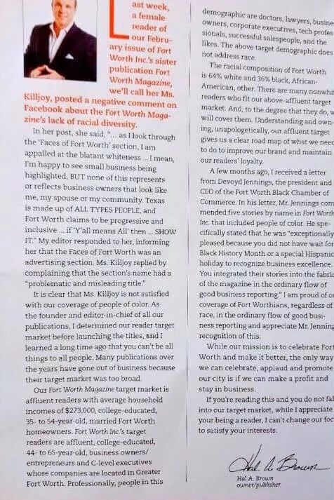 “Last week a female reader of our February issue of Fort Worth Inc.’s sister publication Fort Worth Magazine, we’ll call her Ms. Killjoy, posted a negative comment on Facebook about the Fort Worth Magazine‘s lack of racial diversity,” his editorial reads.