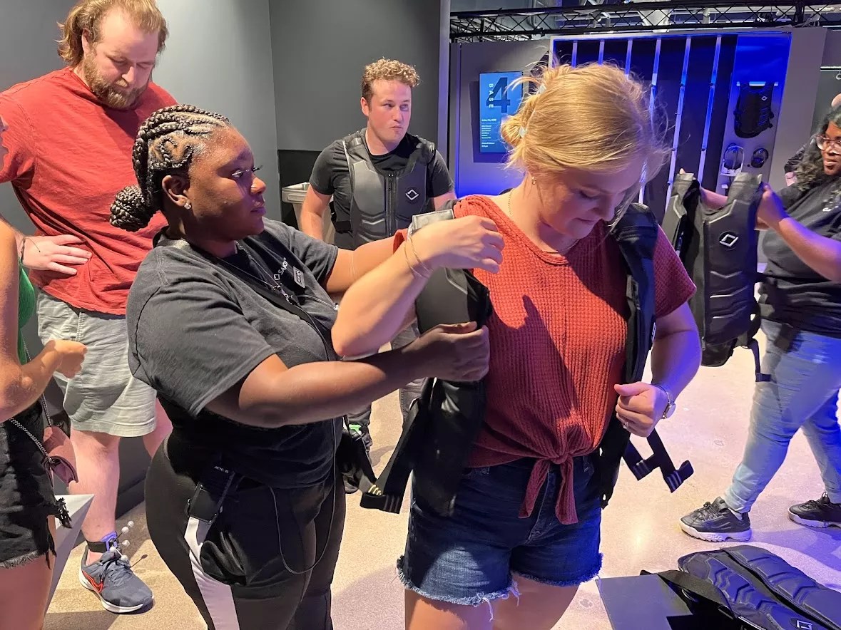 A Sandbox VR team member helps a player into a haptic vest during a virtual experience demo at Sandbox VR’s newest location in Mockingbird Station.
