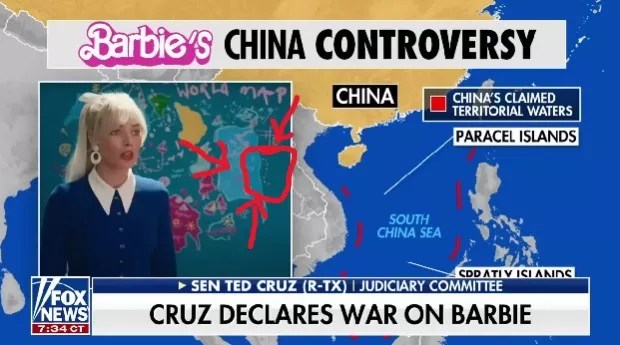 Cruz isn’t alone in thinking the eight-dash line on Barbie’s map (we counted them) is Hollywood’s attempt to appease China’s censors, an accusation that’s followed the U.S. film industry since China became the world’s largest film market in 2020, according to NPR.
