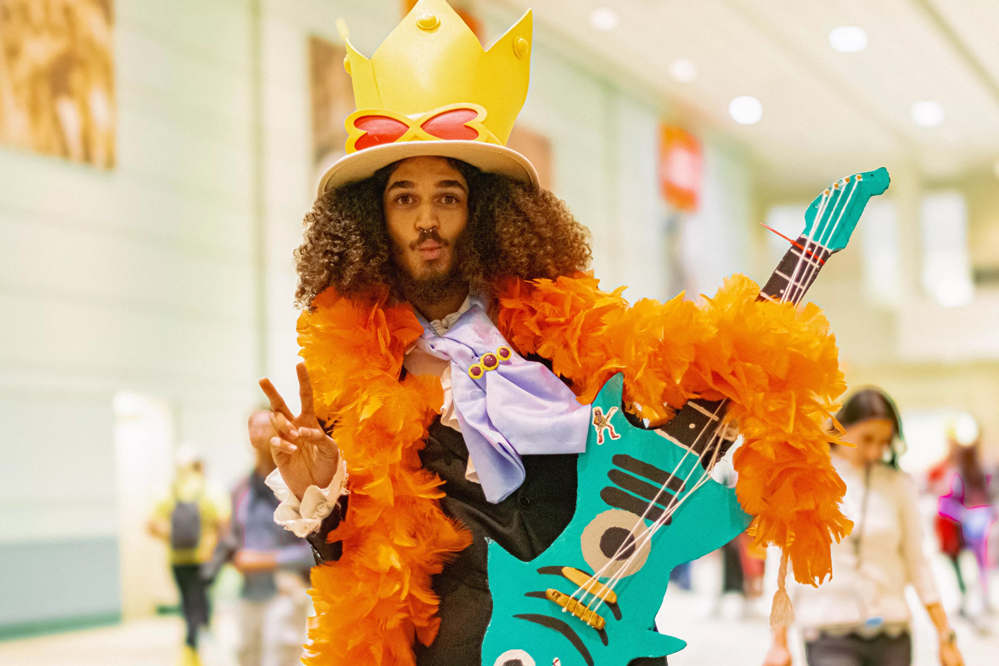 This fan is cosplaying as Brook from the anime series One Piece. Props like this fish-shaped guitar aren’t sold at your average costume store and require a little craftiness.