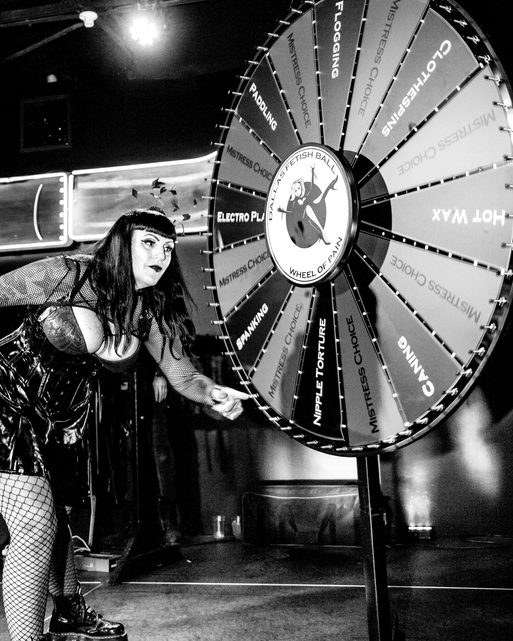 As they entered, guests were greeted by a photo booth – presumably to take “before” photos commemorating the wild night. Immediately after that they found a Wheel of Pain “side show.” Participants could spin a giant wheel with prompts that would make Bob Barker blush, with categories such as “Spanking,” “Hot Wax” “Clothes Pins” and “Mistress Choice,” a wild card of pain/pleasure.