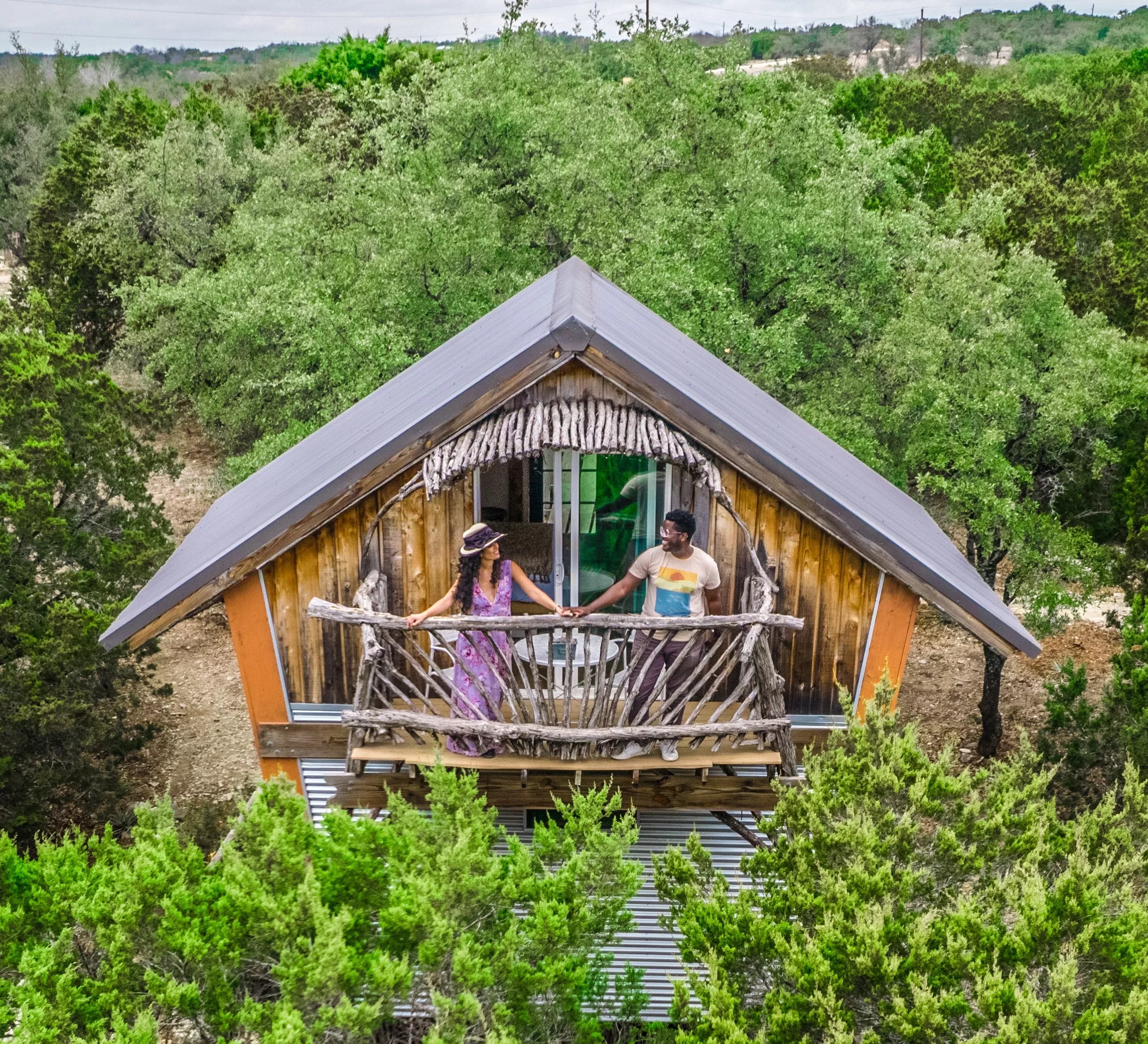 The Birdhouse is a two-story treehouse that offers several vantage points from where to soak up the view overlooking the Texas Hill Country. Ascend an outdoor staircase adorned with string lights and wood from the same oak and cedar trees that stretch across the property to get to your bedroom. There’s even a private balcony where you can enjoy your morning cup of coffee or unwind before bedtime with the stars. Downstairs you’ll find the cutest kitchenette with more authentic, wood touches and an open, stone shower. You’ll also be surprised to find your very own covered patio with a firepit, a seasonal creek to stick your feet in and wandering wildlife, including the owner’s horses, cows and dogs – the cherry-on-top of a serenely unique stay.