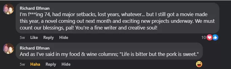 According to writer Danny Gallagher: “I was going through a bit of a rough patch. … So like most of my more recent low moments, I posted a whiny Tweet about the state of my life. I had just interviewed the great Richard Elfman, one of the founding members of my all-time favorite bands Oingo Boingo, who was in town screening his glorious oddball movie Forbidden Zone. Usually when I interview famous folks, it’s a thrill and honor when they follow me on the socials but it’s so rare when one of them reaches out to me even after the press circuit is done. Elfman’s advice along with all my other friends who reached out helped me find some perspective and it pulled me out of a funk that could’ve easily spiraled into something much worse. Plus I figured if Richard Elfman knows me, then I must be doing something right.”