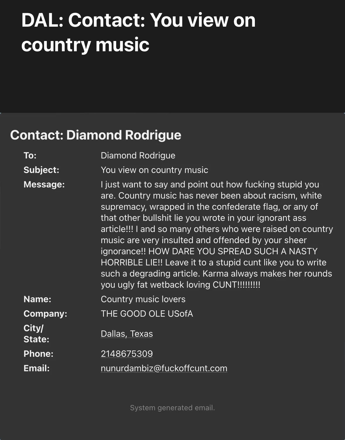But writer Diamond Rodrigue also got a fair share of hater comments from country fans for … actually defending stadium country. We know that phone number anywhere, Jenny, you’re not fooling us.