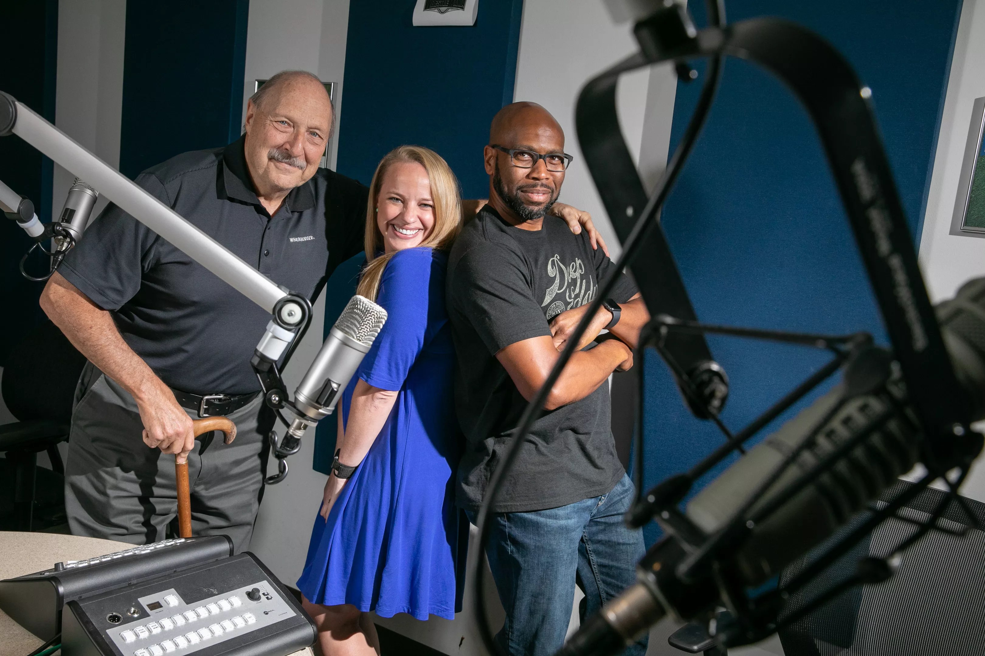 Radio personalities Norm Hitzges (left) and Donovan Lewis hang out with Julie Dobbs.