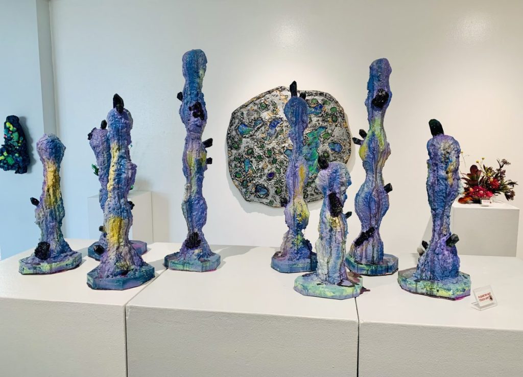 After much planning and with the help of the Mesquite Arts Center, the duo again created a marriage of music and art, but this time, to be experienced in real time. Luminous Frequencies features 29 offerings of Roomiani’s naturalist art, deeply rooted in ecological aesthetics, set to a musical score Xander created under the moniker “Piscea,” tailored to each piece and its individual placement within the gallery space. The pieces emphasize themes of light, reflection, transformation and immersion in various forms. Sculpture, ink prints, botanicals, minerals and crystals all work together in a medley of naturalism that’s aesthetically pleasing if not calming. Xander’s musical score is soothing, a far cry from her previous work in Helium Queens, which now leans more into the realms of Enya or Air.