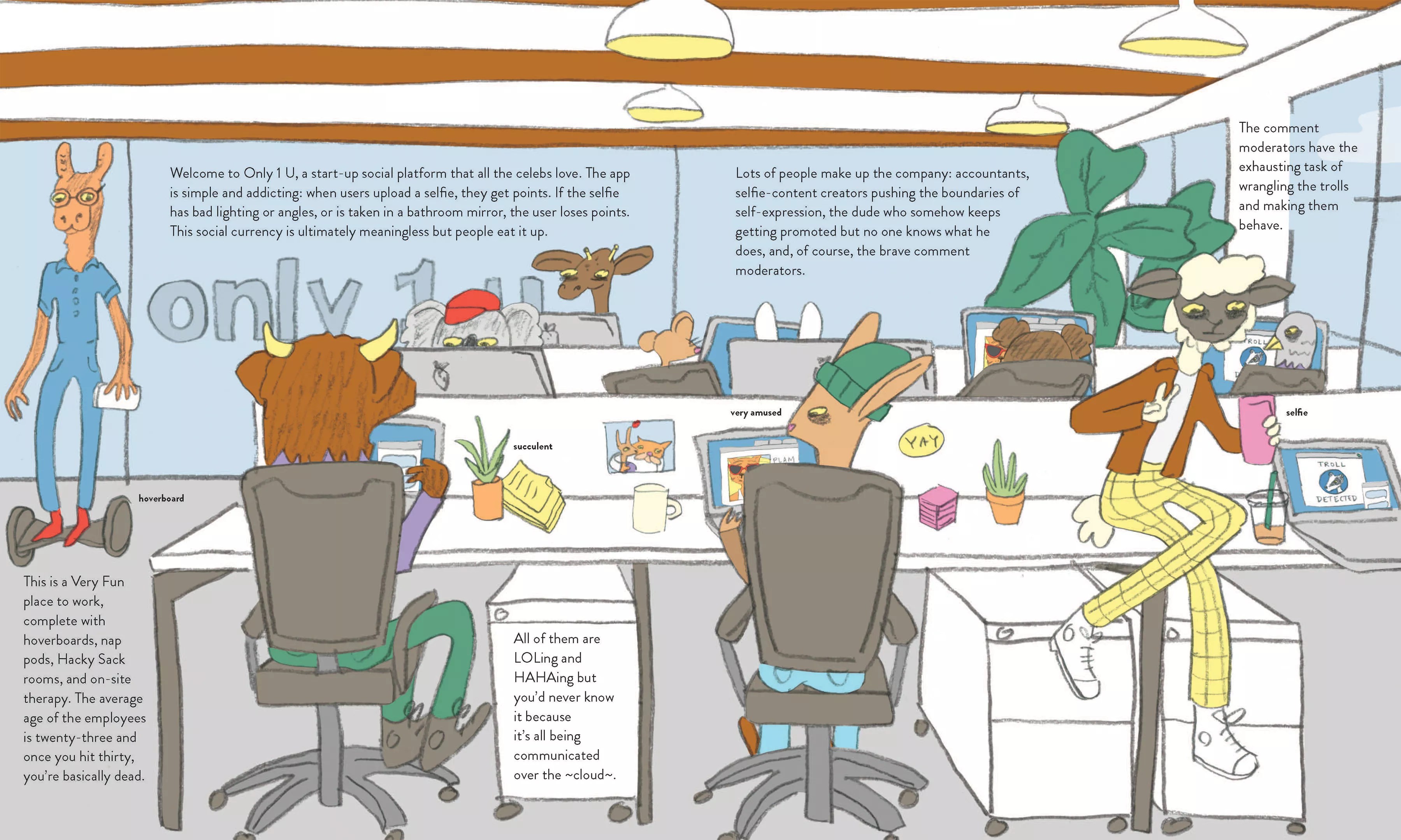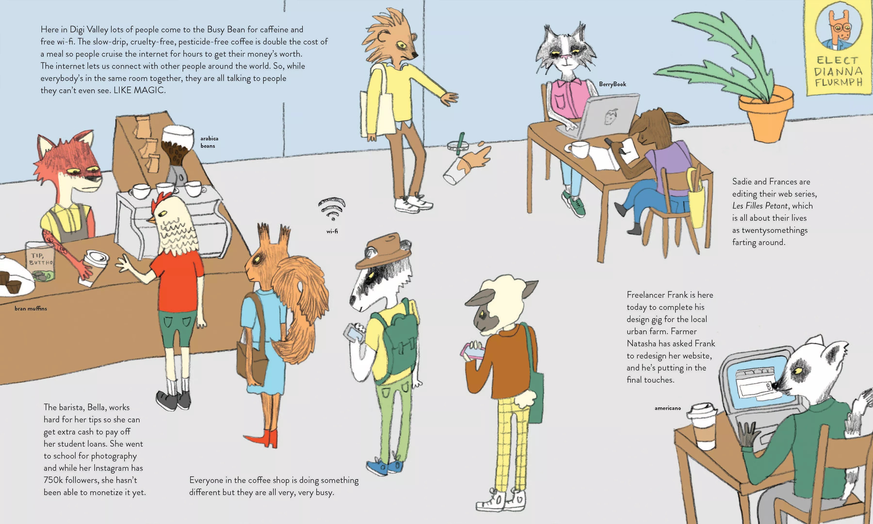 Children will enjoy the book for the pictures and the simple sentences, but millennials will enjoy the book for the dry, satirical and spot-on humor. The book frequently references the hilarity of appearing as someone different on social media, how more people freelance full-time to earn a living